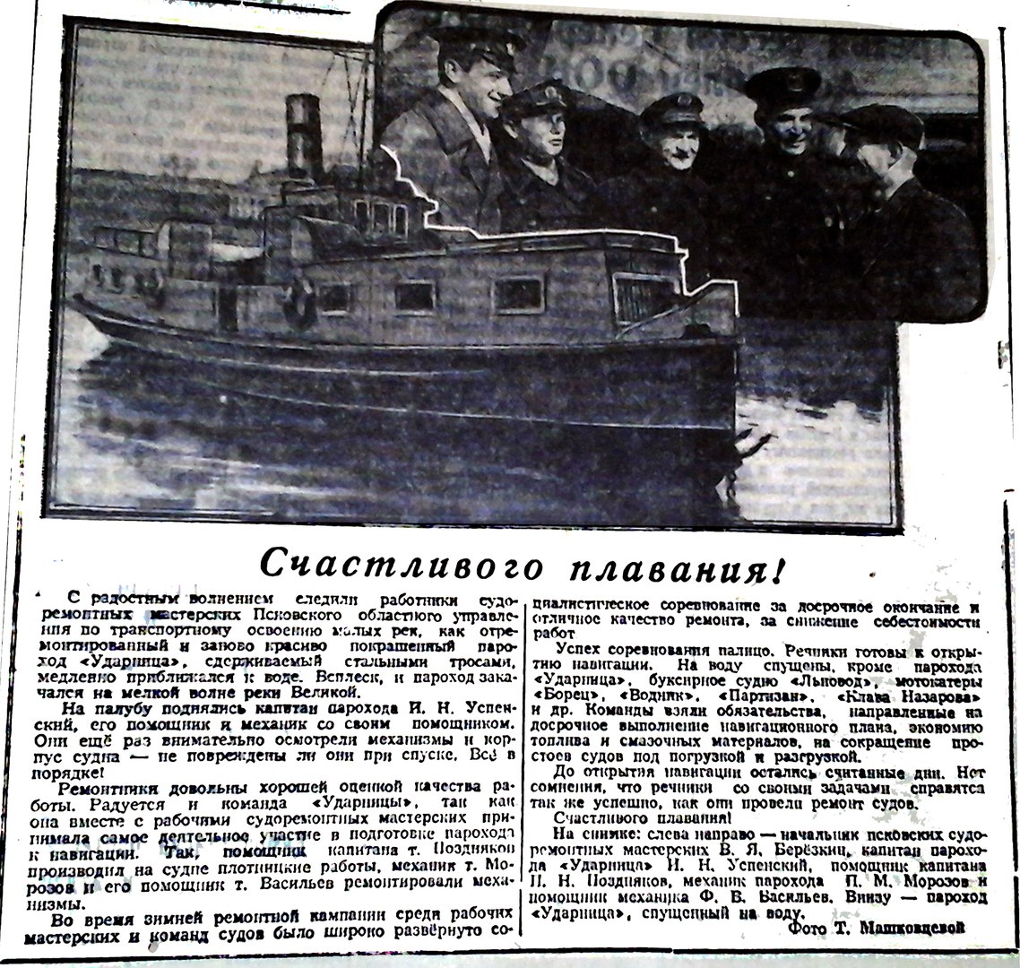 Fotosüüdistus ka . Dateering 1955. Kandvat nime "Udarnik" aga et sellenimelist Pihkva materjalides mainitud pole, siis tundub, et on ikkagi tegu suvel üles riputatud "Udarnitsaga", tõsi, nüüd juba natuke ümberehitatud kujul. Sõitis reisiliine Pihkva järve lõuna ja edelaosas. Pihkvalased said sel suvel veel ühe asjaga hakkama. Nende jaoks on omamoodi sümboliks "Aleksander Nevski" kui esimene laev, mis hakkas Venemaa poolelt Tartu vahet käima. Ja et tal täitus vettelasmisest 60 aastat, siis korraldati laeva praeguse seisukoha juures väike miiting http://www.pskovgorod.ru/news.html?id=13327