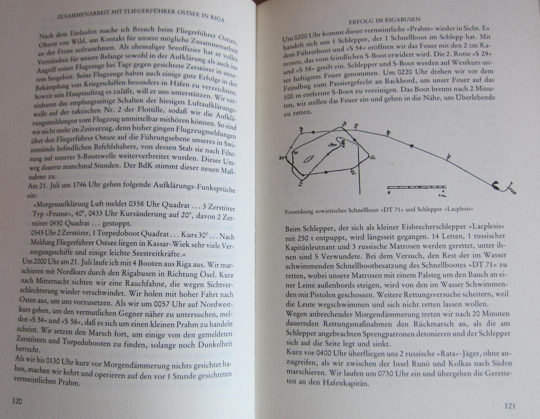 Wegen schlechte Sicht Vorstoß in Vetela-Bucht unterlassen. Ab Qu 6551 im Aufklärungsstreifen nach Nord 0010 Qu 6522 l.o. Vormarsch Wegen Sicht nur mit 20 sm Fahrt parallel zur Küste. Qu 6288 Schlepper mit angenommenen Prahm. Weiter vorgestoßen bis Qu 6294 l.u. Leuchtturm Poevalad Blinkgruppen weiß 2 gesichtet. 0130 Uhr Kehrt gemacht. Qu 6522 l.o. Schlepper wieder in Sicht mit S-Boot im Schlepp. Ab 0216 bis 0230 Uhr laufende MG-Angriffe der S-Fl. auf russ. S-Boot DT 71 und Schlepper. Besatzung nach heftiger Abwehr bei Brennen des Bootes ausgestiegen, fast alle beim Gefecht gefallen. Größter Teil Schlepperbesatzung (Letten) gerettet, darunter ein russ. Kaptlt. (Torp. Spezialist) und 3 russ. Matrosen. Wegen starker Helligkeit 0242 Uhr Rückmarsch. Danach Schlepper, der 4 Torpedos an Bord hatte, in die Luft geflogen. Insgesamt 1? Gefangene, darunter 5 Verletzte, Schlepper war ehem. Lettischer Eisbrecher „Lacplesia“ mit 250 t. Bei Domesnäs 2 „Rata“.