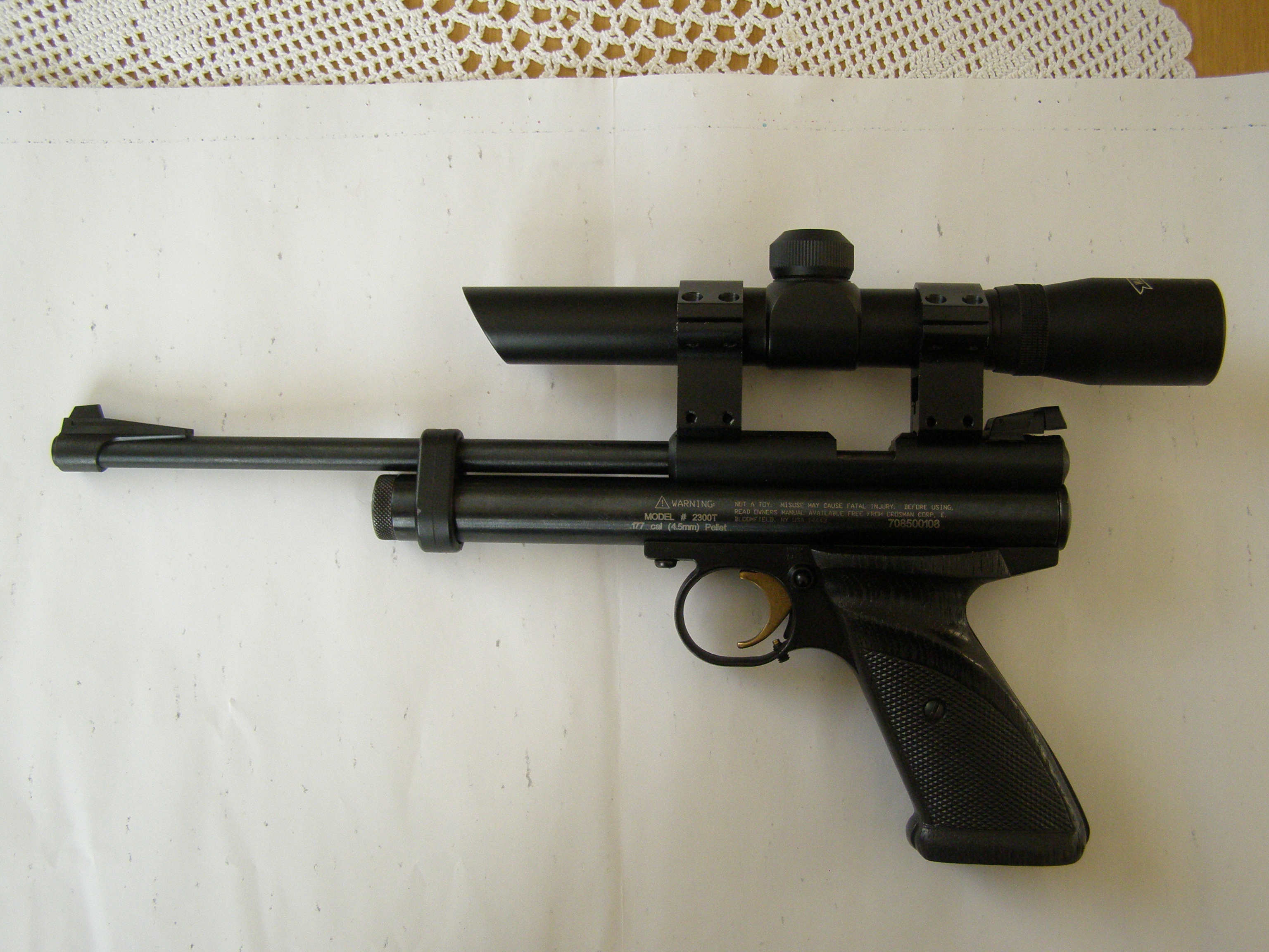 Müüa siis otse USA-st toodud õhupüstol Grosman-2300T.Kaliiber-177(4,5mm).Balloon raua all,esimese lasuga lööb lahti.Raua pikkus 250mm,kaal 1kg.Algkiirus 165m/sek.Optiline sihik "Walther-2*20,sälk reguleeritav.Päästiku tugevuse reguleerimine.Hind 320 eur.