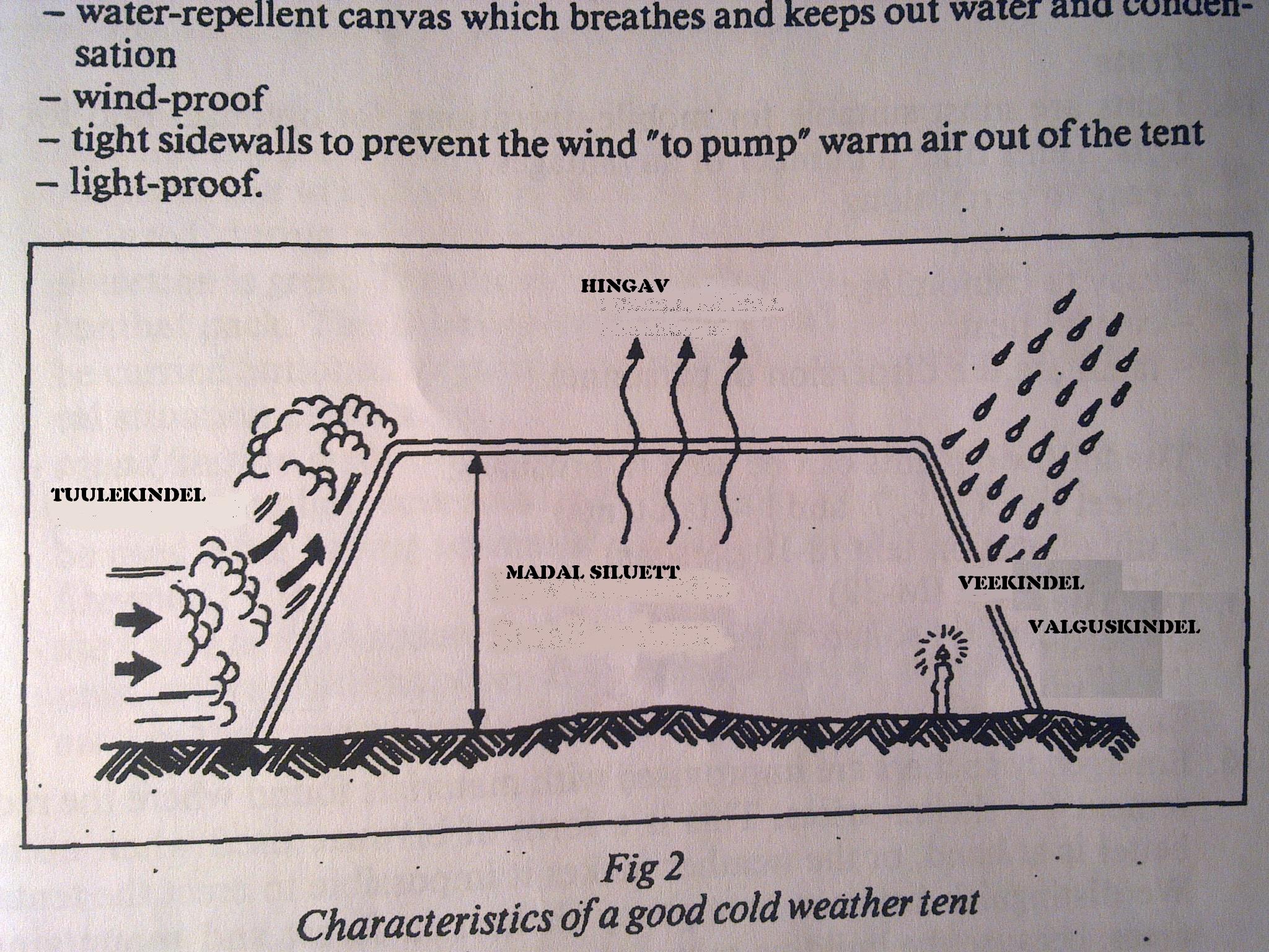 Pilt ideaalse telgi mudelist. Kütmise seisukohalt on eriti oluline madal siluett, et soojust jääks võimalikult palju magamistasapinnale. Vähetähtis pole ka tuulekindlus aga ka vihmakindlus, kergus, hingavus, kokkupanemise lihtsus jne.
