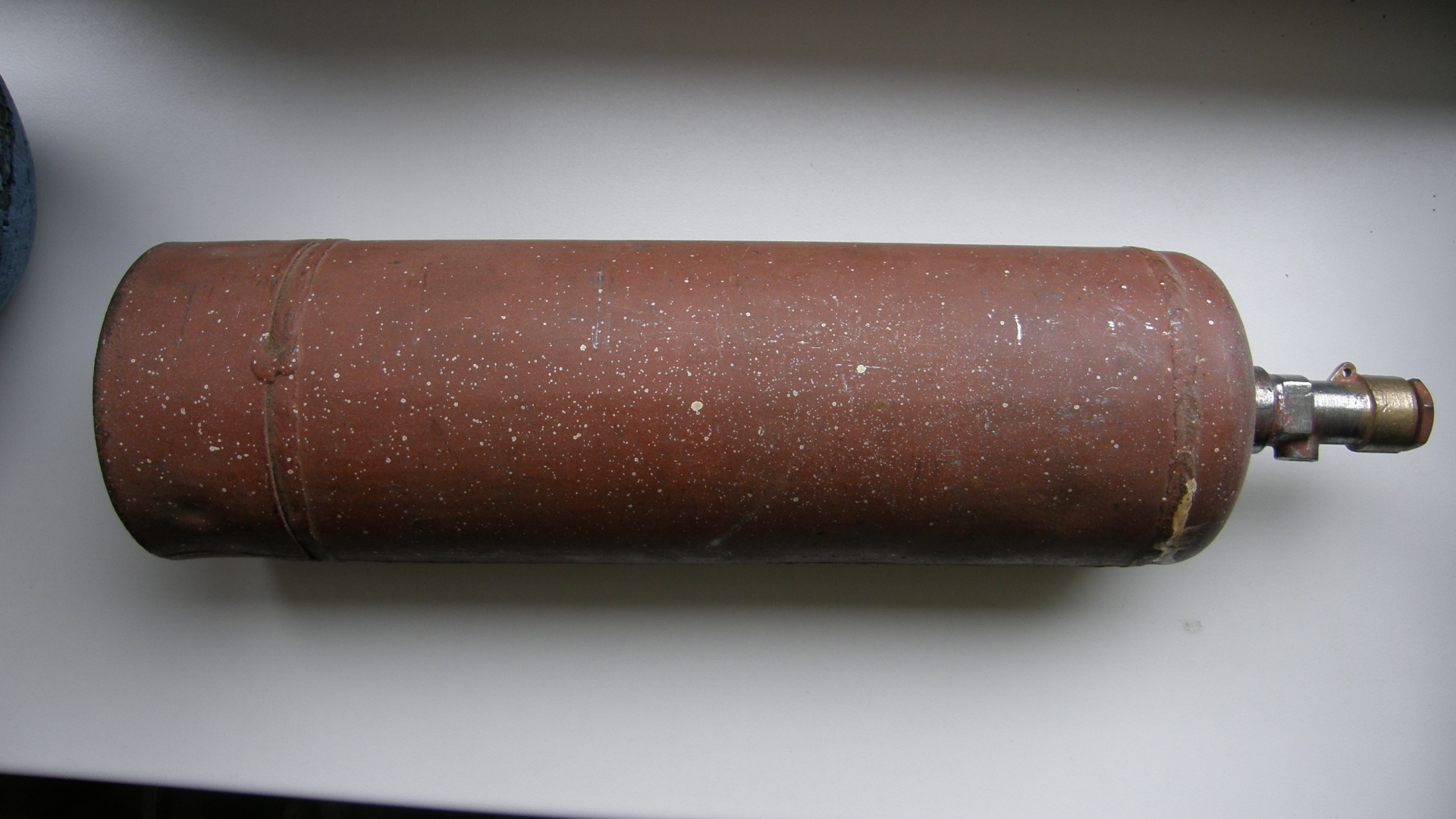 Sai üks vana asi jälle tuppa tassitud. Ise arven, et sakslase tulekustuti. Kunagi ammu ammu nägin sellist asja sugulase pööningul, kraani käepide oli küljes ja kana kraani korpusel. Minu omal kana puudub. Selle asja pikkus 35 cm ja läbimõõt 9cm.