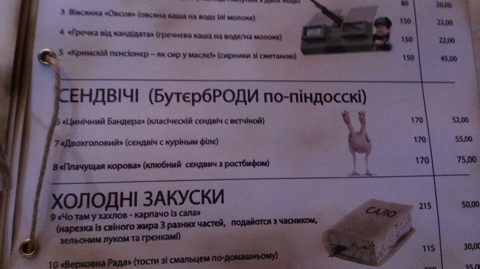 Minu silmad loevad juuresolevalt pildilt ukrainakeelsena välja veel "Nuttev lehm" ehk klubivõileib röstbiifiga, ja