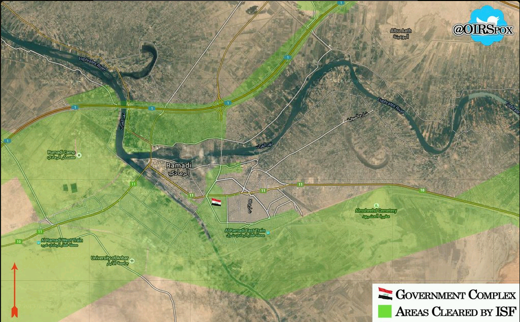 Tänane kaart Ramadi linna kohta, USA koalitsiooni (Operation Inherent Resolve) kõneisikult kolonel Steve Warren.