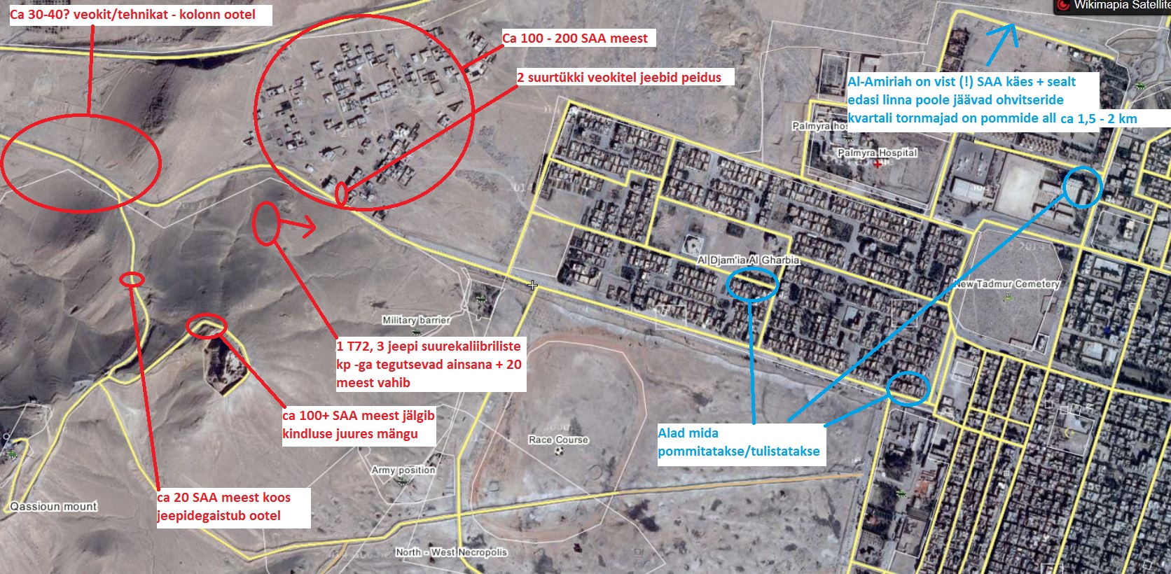 Kuna see online Palmyra jupp sai seal läbi, siis panen siia, mis silma jäi ca 11:00 - 13:00. Üldiselt mingit otsest rünnakut ei toimu. Tulistamisega tegelev jeepide ja tankiga grupp hoiab ala lihtsalt tule all. Lennukitelt kõmmutatakse piirkondi. Linna sisse keegi ei kipu, ilmselt meeldivaim oleks, kui ISIS sealt ise välja tõmbuks. Kindluse juures mingit lähilahingut ei paista olevat toimunud. ISIS tõmbus lihtsalt välja, kui ümbritsevad kõrgendikud SAA poolt ära võeti.