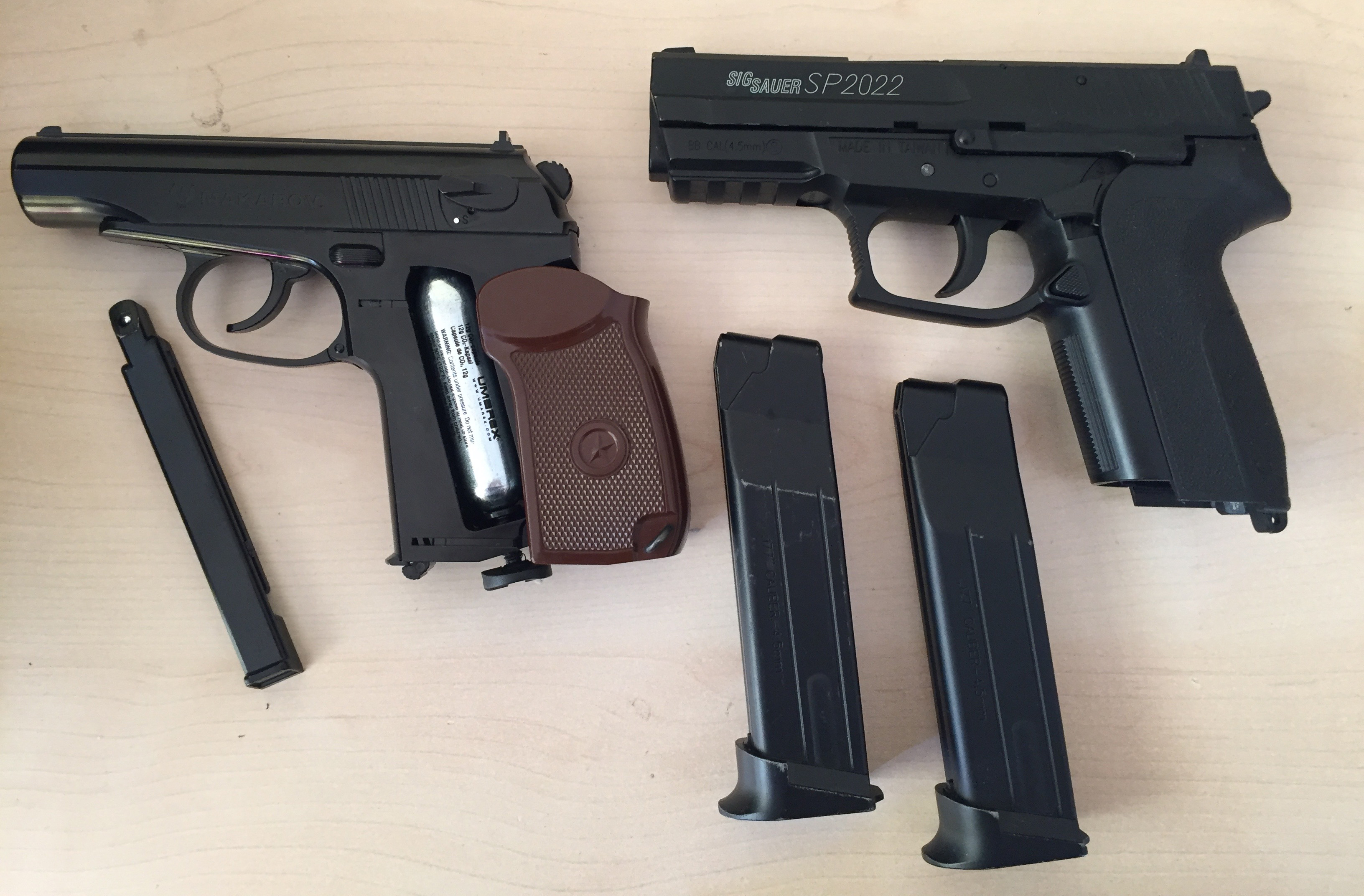 Pakkuda Umarexi Makarov ja Sig Saueri SP2022. Lasevad CO2 ballooni jõul 4,5mm terasmoona. Relvad on mõlemad umbes 7 kuud vanad, Makaroviga lastud 3 salvetäit (1 balloon CO2) ja Sig Saueriga ca 10 salvetäit. Sig Sauerile on kaasa anda 2 salve, Makarovile 1.