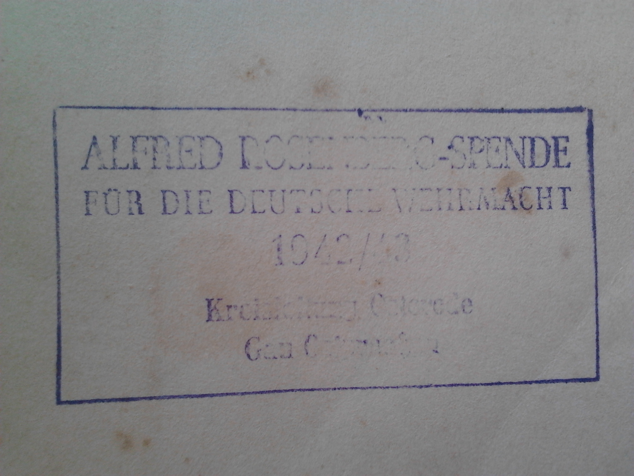 2. Wehrmacht'i naljaraamat Alfred Rosenbergi kingitus saksa sõduritele! Raamatus kurikuulsa Ida-alade riigiministri Alfred Rosenbergi tempel - kingitus saksa sõduritele 42/43. Eesti juurtega mees, kes hukati Nürnbergis poomise läbi. Tiitellehel eestipärane nimi sisse kirjutatud. Raamat puhas ja heas korras. Kodumaist päritolu.