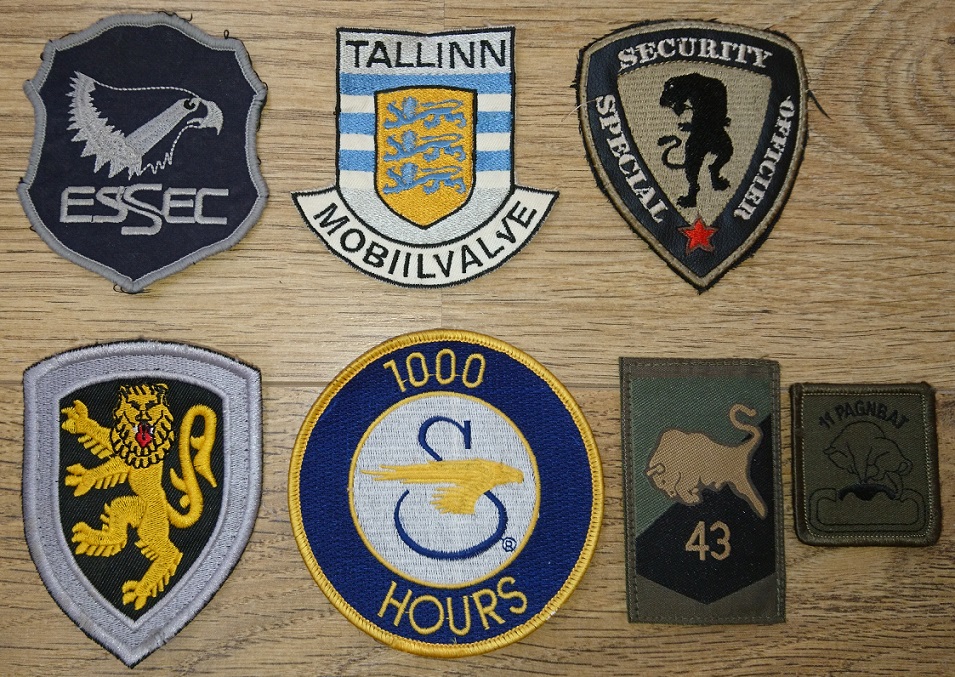 Esimeses reas 1990-te turvade embleemid, viimane on huvitav - see oli koos teiste vanade turvafirmade embleemidega, ent pole sellist Eestis enne näinud. Tikitud on kunstnahale ja imeliku kirjaveaga (officier). Kui keegi teab selle "musta pantri" kohta täpsemalt, siis palun jagage infot!