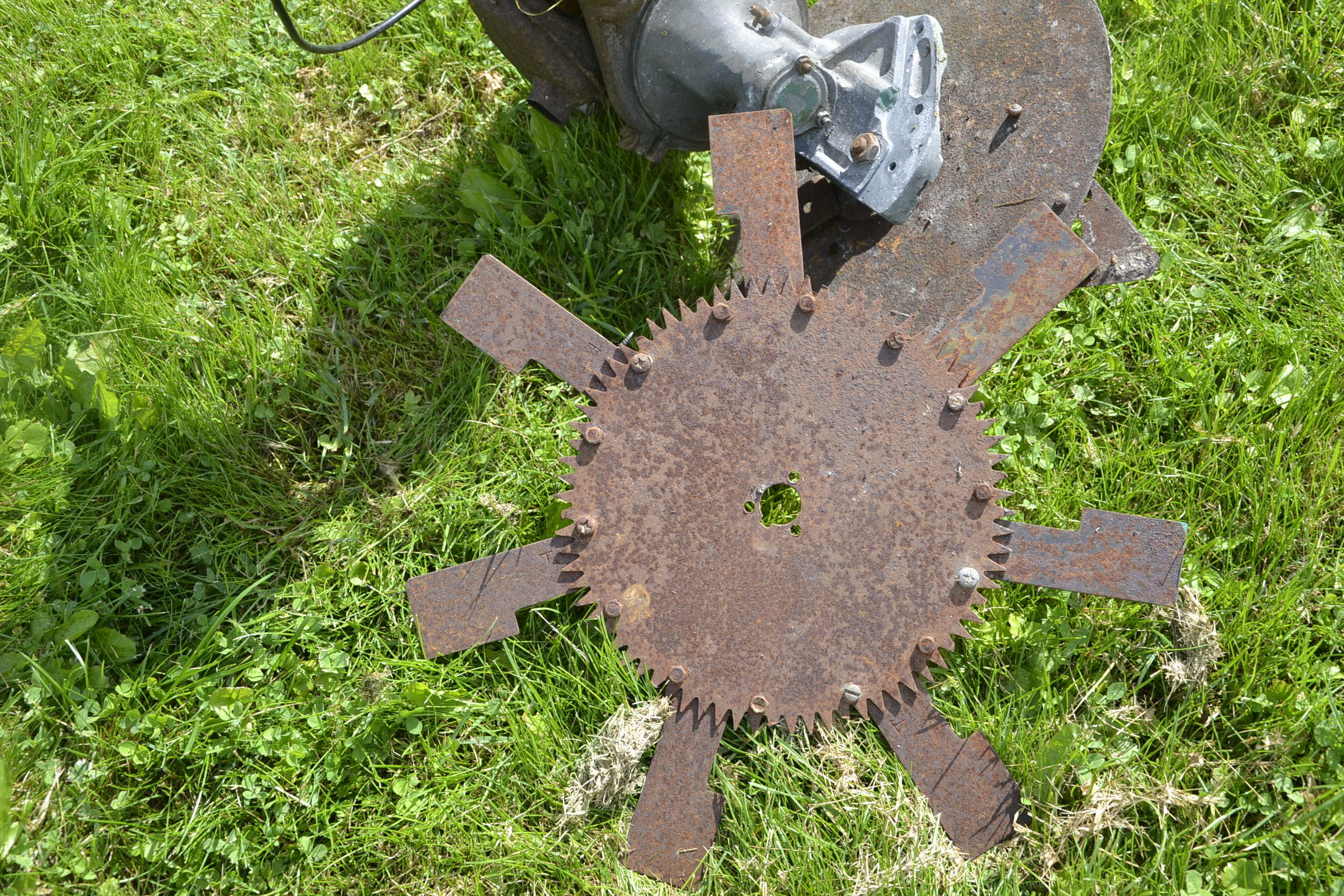 aga muru saab sellise kettaga niita täitsa edevalt. Lihtsalt tuleb arvestada, et sellise ketta inerts on muljetavaldav ning tasakaalustamisega tuleb vaeva näha. Kunagi ehitasin ise muruniidukile külvikukettast ja mõnest niidukiterast sarnase asja, ainult lendteradega. Põhjus selles, et vana hooldamata taluaed oli vaja elule äratada ning ketastera oli muruniidukile säärases keskkonnas tervislikum. Nimelt lööb standartne jäik latt-tera kõvema takistuse taha kinni jäädes niiduki väntvõlli kõveraks, kettaga, kus väljaulatuvaid takistusi ei ole, seda muret pole. Mitu aastat töötasin selle kettaga, kuni muru ükskord korda sai ja vajadust enam ei olnud.