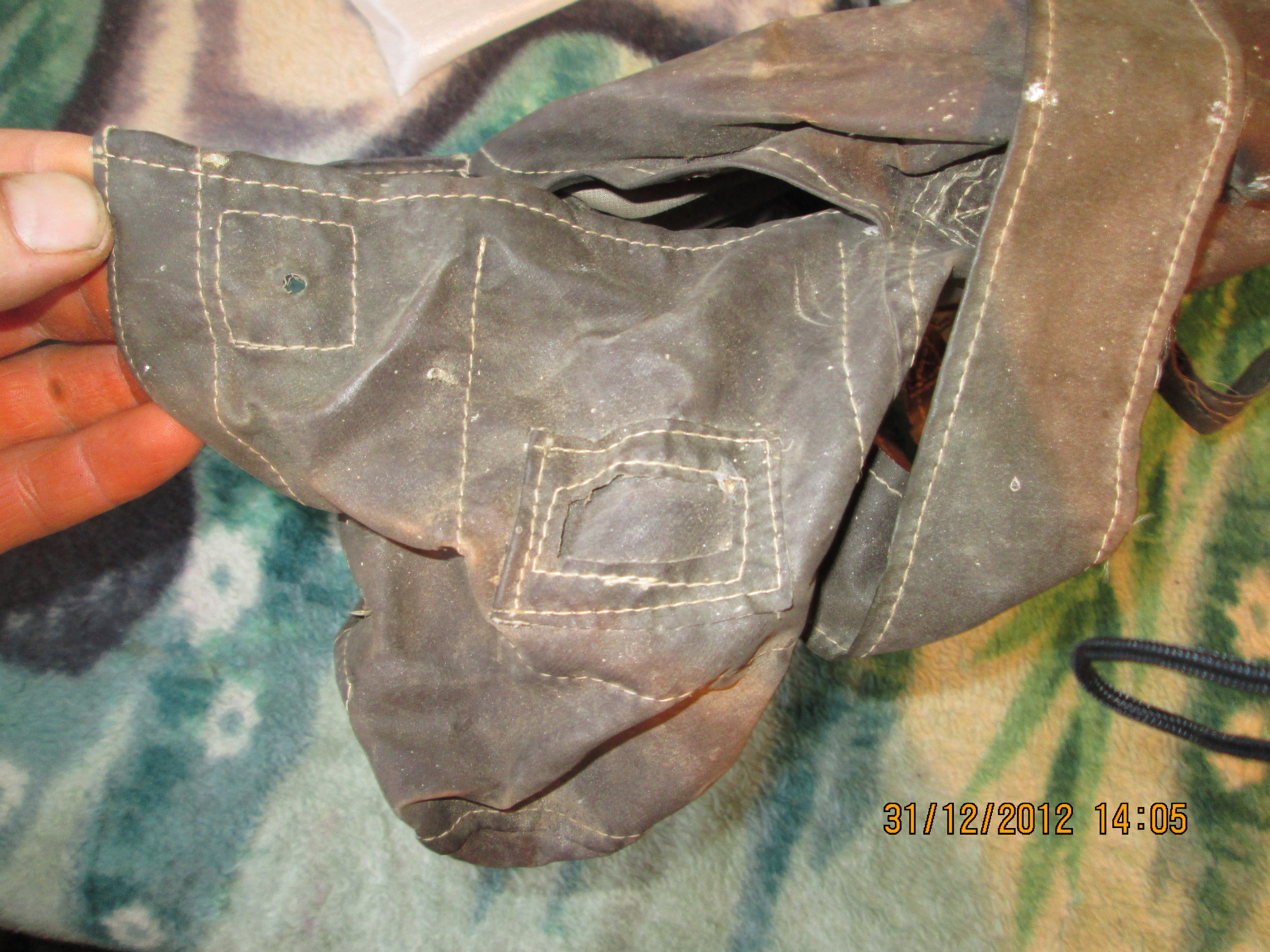 Pildilt ei saa küll hästi mõõtmetest. Sarnasest materjalist on tehtud gaasimaske kotte, kuid klambrid viitaks nagu muule.