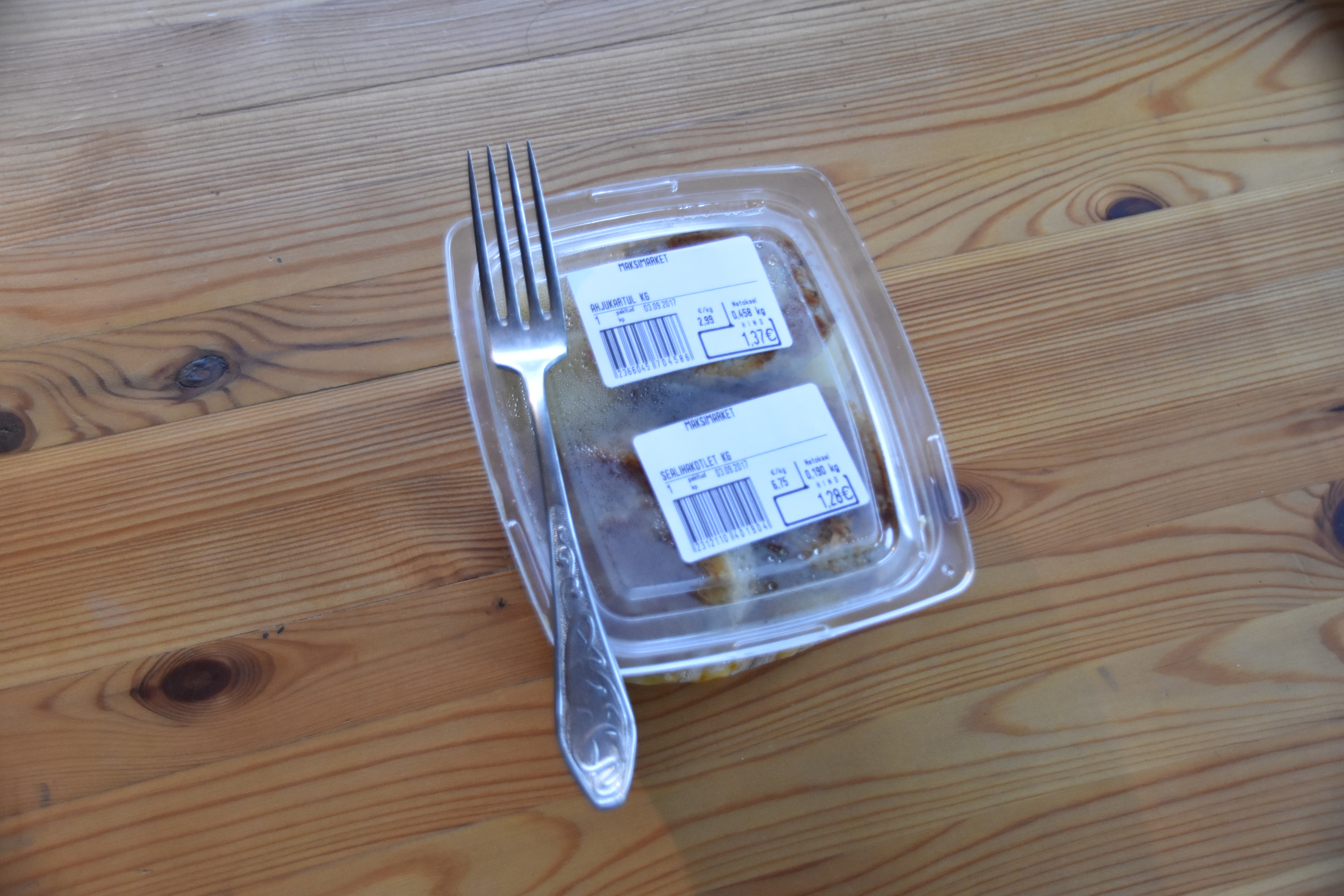 Oleks kaks kartulit vähem ja ühe kotleti rohkemvõtnud, oleks täpselt kolm eurot kätte saanud, aga see selleks.