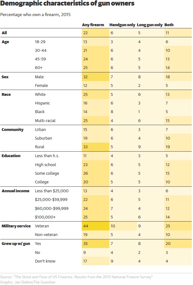 Nagu siit näha, on kõige suurem grupp see, kellel on nii püstol/revolver kui püss. Relvade arv on vaid üsna lõdvas seoses inimeste arvuga, kellel on relv, mida väljaspool kodu kanda (17%) ning veel lõdvemalt seotud inimeste arvuga, kes seda tegelikult teevad (4-5% ?).