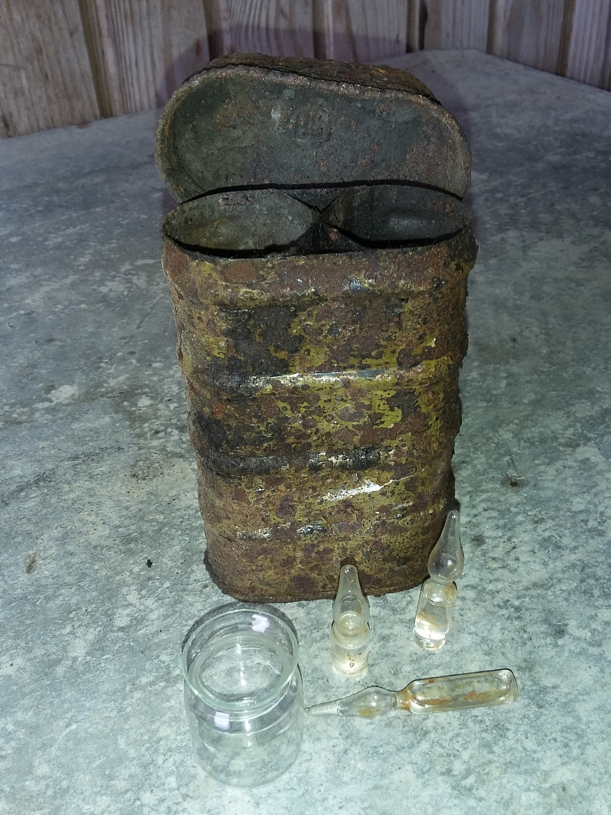 Kõige kummalisem, et osadel on sees väike klaasist purgike, mille sees valge pulber. Teistes samasuguse välimusega karbikestes klaasist ampullid läbipaistva vedelikuga. Teadjamate sõnul oli selles hoones viimase sõja ajal asunud sakslaste laskemoonaladu.