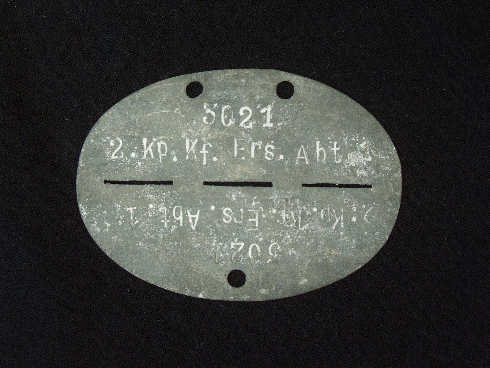 Natuke segane erkennungsmarke tundub olema, rasvasel poolel puudub korrektne isikunumber mõlemal osal. Kulunud poolel muidu ilusti nr 55 olemas. Tavaliselt kehtetu info tõmmati kriipsuga maha või eemaldati muul viisil.