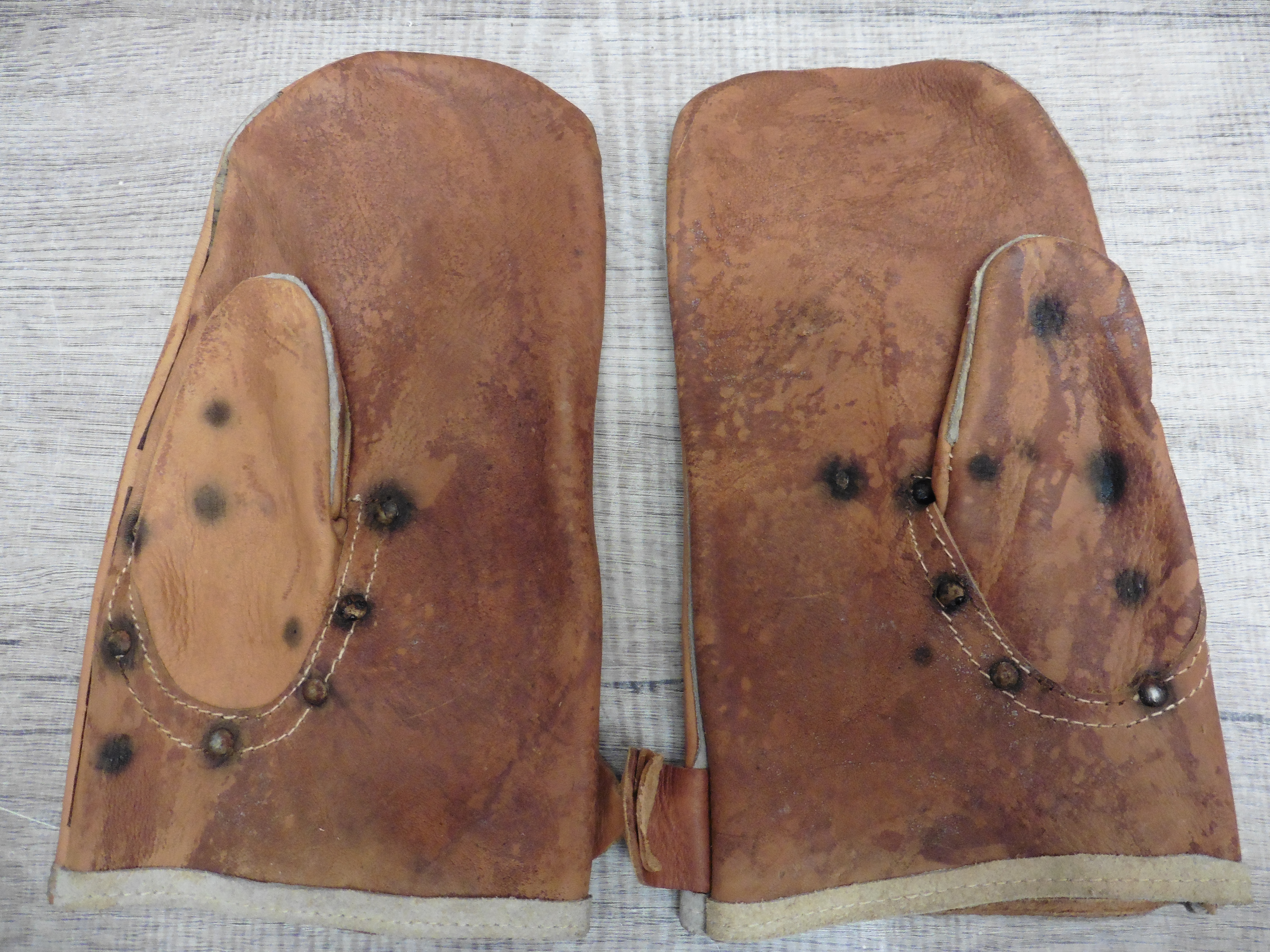 Mulle toodi sellised kindad. Öeldi et olla leitud Tallinnas ühe vana maja keldris asunud saksa kulli pildiga puukastist. Ei oskagi arvata, kas tegu II Maailmasõja aegsete saksa kinnastega? Ehk on keegi näinud ja teab öelda? Seanahksed ja neetidega. Pöidla osa on eraldi veel needitud.