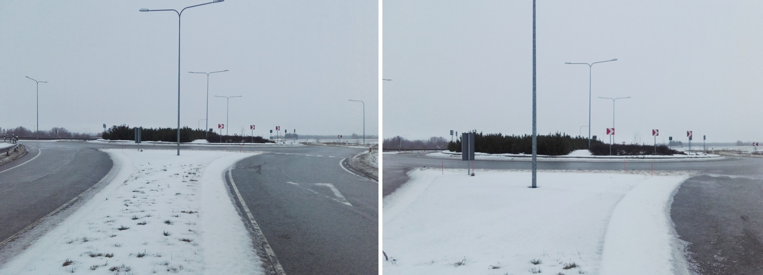 Esimesel pildil on RING Nr.1 vaade n.ö. "küljelt", kus on näha teeprofiili suuremat sorti kalle + jama täis istutatud ringristmiku keskosa, mille tagant ei paista välja ringil liikuvad sõidukid ega ole ülevaadet ka ristmiku vastaspoolel toimuvast. Teisel pildil on sama ringristmik kalde madalamas küljes asuvalt haruteelt ringile lähenedes. Ja kolmandal pildil on RING Nr.2 kus ringi keskele on kuhjatud sihilikult mulded. Eemalt vaadates ei varja need vaadet nii palju, kui lähemale liikudes, ehk mida lähemale ringile liikuda, seda kõrgemad need kuhjatised on ja seda vähem jääbvaba vaatevälja, et saada aru ristmikul ja teiselpool ristmikku toimuvast.