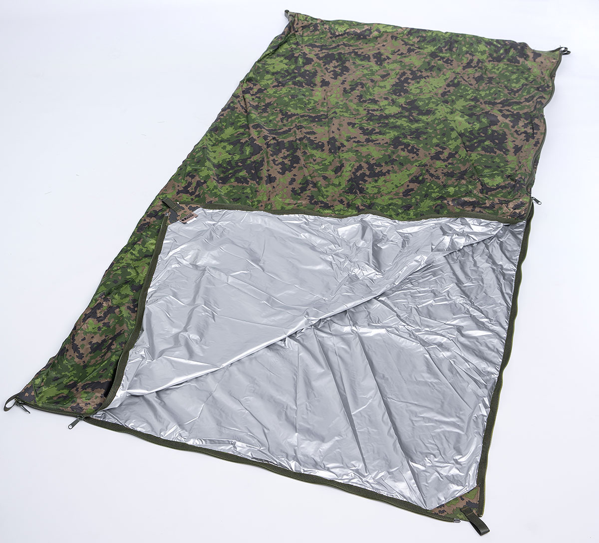 See Savotta paksem koormakile on täiesti veekindel ja kindlasti läigib vastu, sest pinda ei ole kaetud mingi maskeerimisvärviga. Näiteks Varusteleka Särmä Lämpöviitta, ehk põhimõtteliselt sõjaväe vajadusteks kohandatud varjualune/telkmantel/magamiskott on kaetud M05 kamoga, kuid on ka oluliselt raskem ja kallim, pildil on 160€ maksev õhuke versioon, paksemas on väike vooder ja see võtab kokkupanduna sama palju ruumi kui suvine magamiskott https://www.varusteleka.fi/fi/product/s ... itta/57470