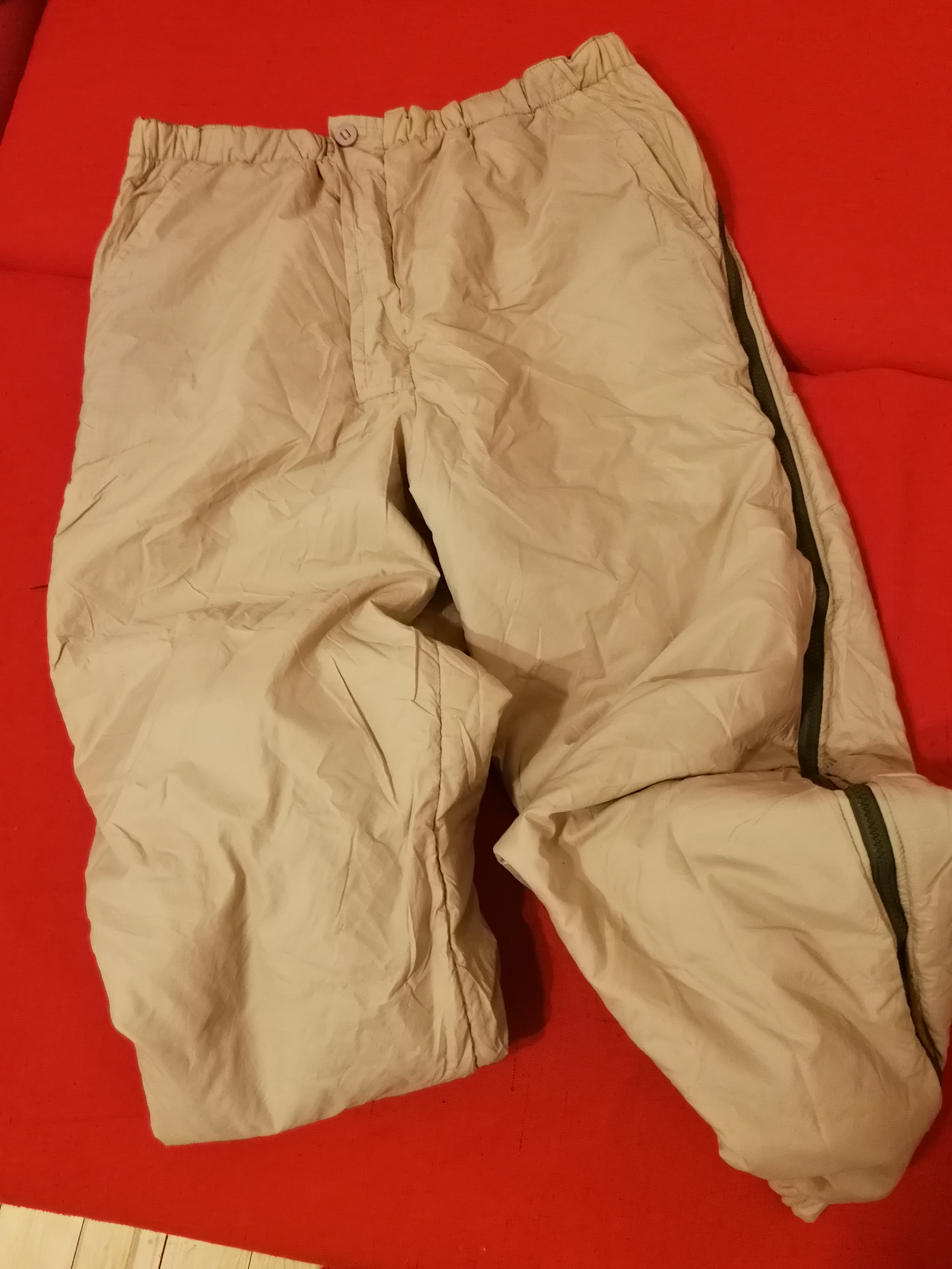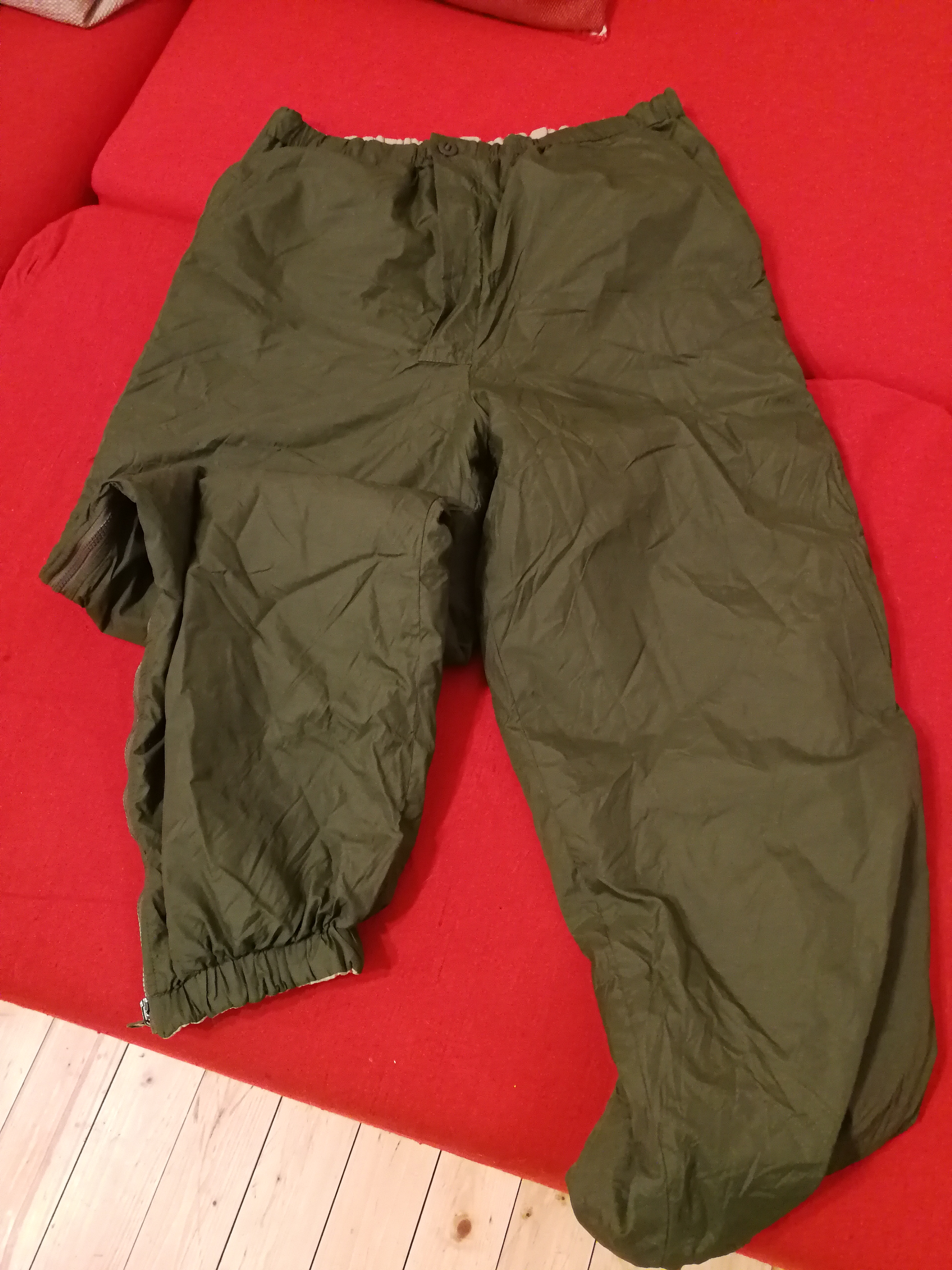 Briti armee soojad püksid, külgedelt lukkudega avatavad. Üks pool kõrbe värvi ja teine roheline. Kuigi suurus M, siis endal pikkus 184 ja püksid üleval ei seisa niisama, peaks panema parema püksikummi. Ise olen kasutanud ca 3 korda. Ideaalne kuskil OP´s teiste pükste peale kiiresti tõmmata. Pükstel mingi õlipleki moodi asi. Hind 20.-