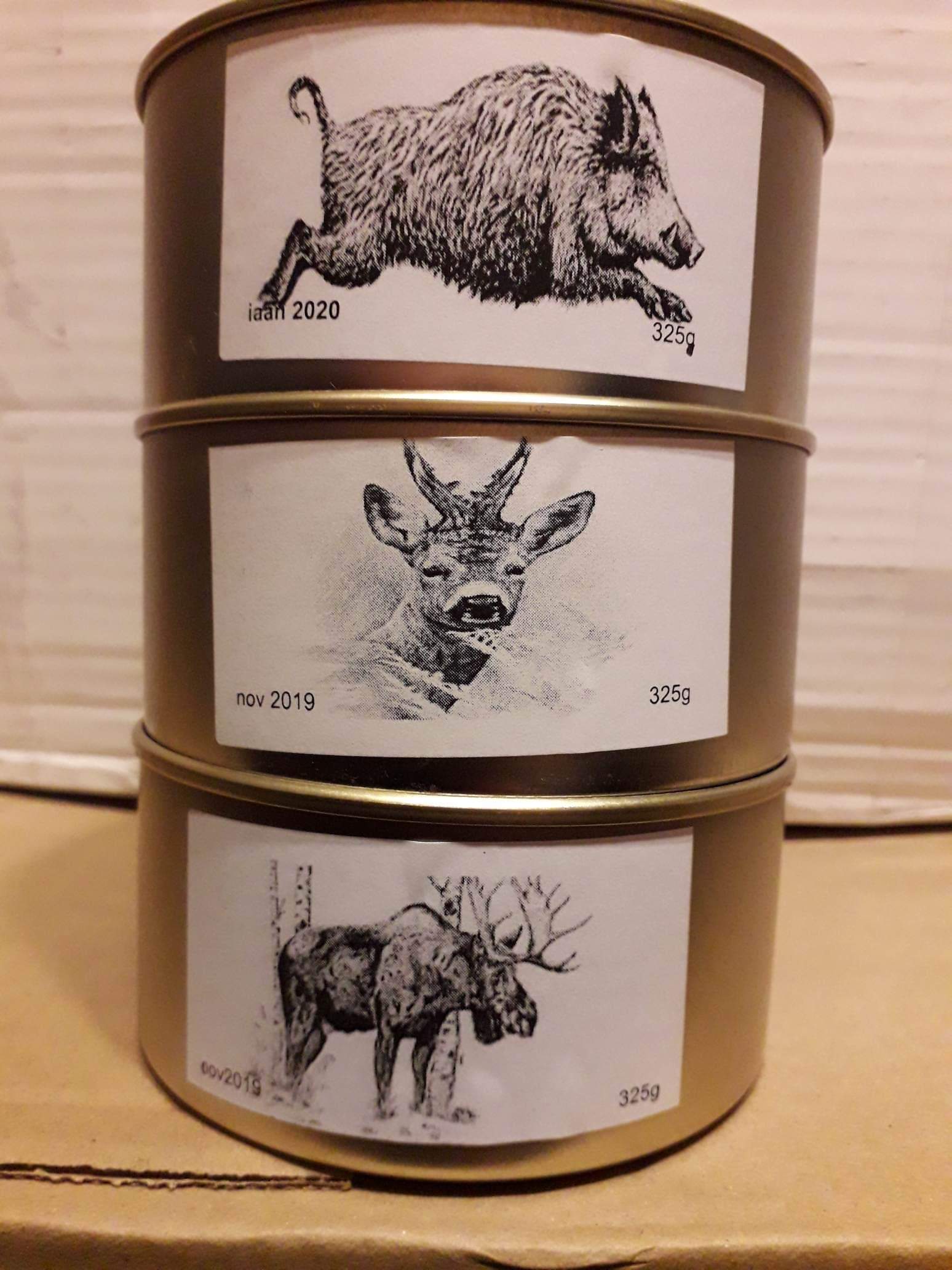 Pakkuda siis erinevate metsloomade konserve. Jahimehe enda valmistatud, konservi neto kaal 325g.