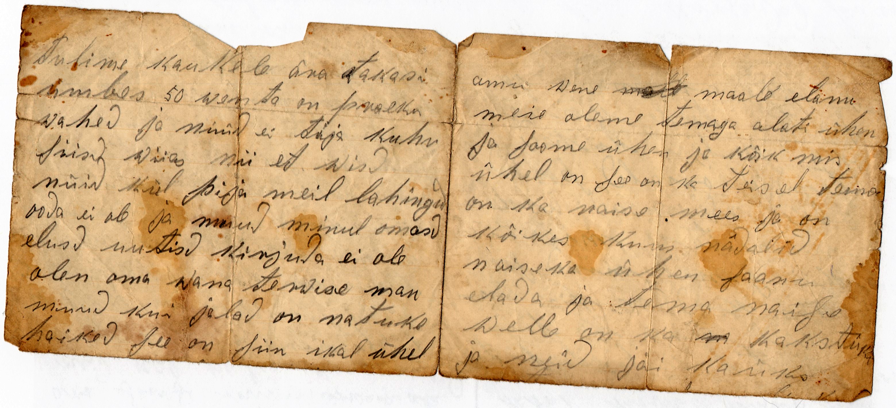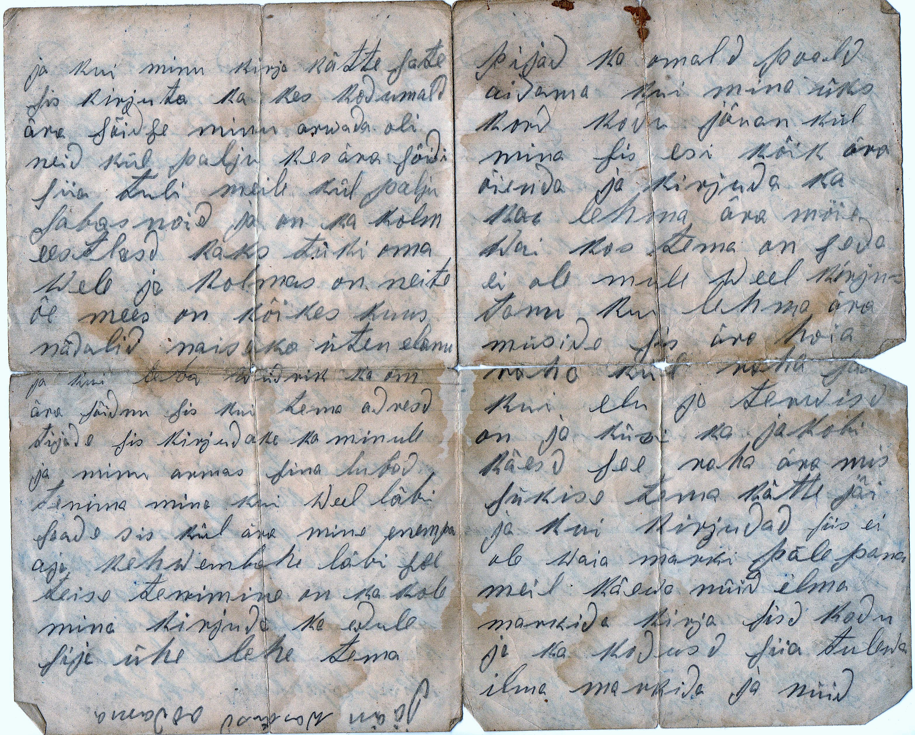 ...ja kui minu kirja kätte saate, siis kirjuta ka kes kodumaalt ära sõitsid. Minu arust oli neid küll palju, kes ära sõitsid. Siia tuli meile küll palju varumehi (täendust ehk sabasnoid - запаснои) ja on ka kolm eestlast. Kaks on vennad ja kolmas on nende õemees, kes on kõigest kuus nädalat naisega koos elanud (abielus olnud). Ja kui Leida Viidnik (Leida Viidik) ka on ära sõitnud, siis kui tema aadressi teate, siis kirjutage ka minule. Ja minu armas, sina lubad teenima minna. Kui veel läbi saate (hakkama saate, ära elate) siis küll ära mine. Ennem aja kehvemini läbi. See teise teenimine on ka kole. Mina kirjutan ka Eedule (Edgar?) siia ühe lehe. Teda pead ka omalt poolt aitama. Kui mina üks kord koju jõuan, küll mina siis ise kõik ära õiendan (korda ajan). Ja kirjuta, ka kas lehma müüsite ära, või kas tema on müünud. Seda ei ole mulle (sina) veel kirjutanud. Kui lehma ära müüsite, siis ära hoia raha raha pärast, kui elu ja tervist on. Ja küsi ka Jakobi käest see raha ära, mis sügisel tema kätte jäi. Ja kui kirjutad, siis pole vaja marki peale panna. Meil käivad nüüd kirjad ilma margita. Siit koju ja ka kodunt siia tulevad kirjad ilma markideta. Ja nüüd jään vastust ootama.