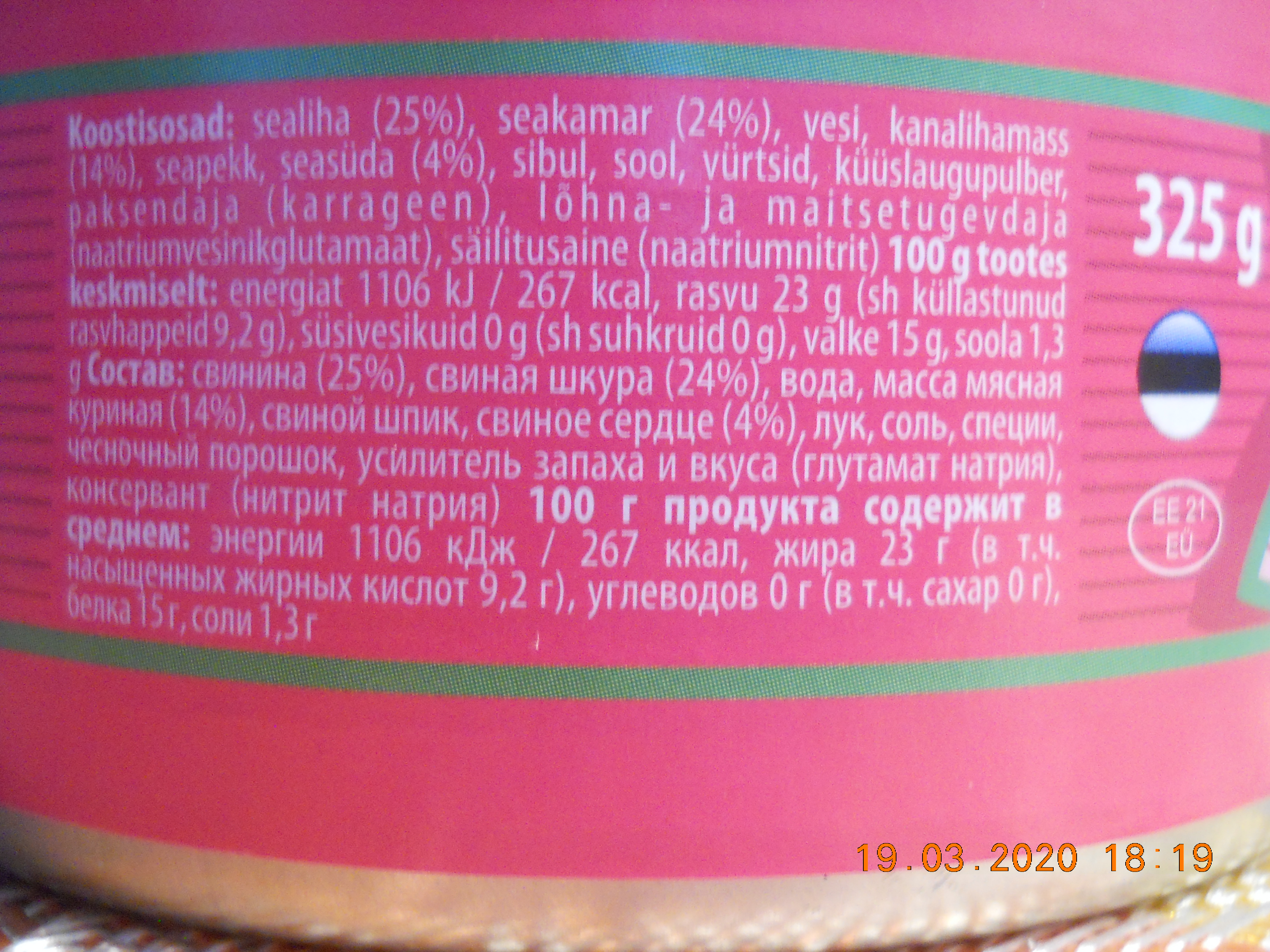 Viimsepäeva konservide puhul ma keskenduksin markeeritud parameetritele. Ja maitse peaks olema hea või väga hea.Leo kirjutas:Tänan akf mart2 heade ideede eest, üritan meeles pidada, et saab ka kolmandat moodi jänest teha. Akf herman30 tutvustab ülemise riiuli tooteid, see väike konserv on kahtlemata kvaliteetne, praktiliselt siga maitseainetega viieks aastaks purki maetud, kuid konserv maksab u 4 $, nii et kilohind on räige. Panen siia ka koostise: