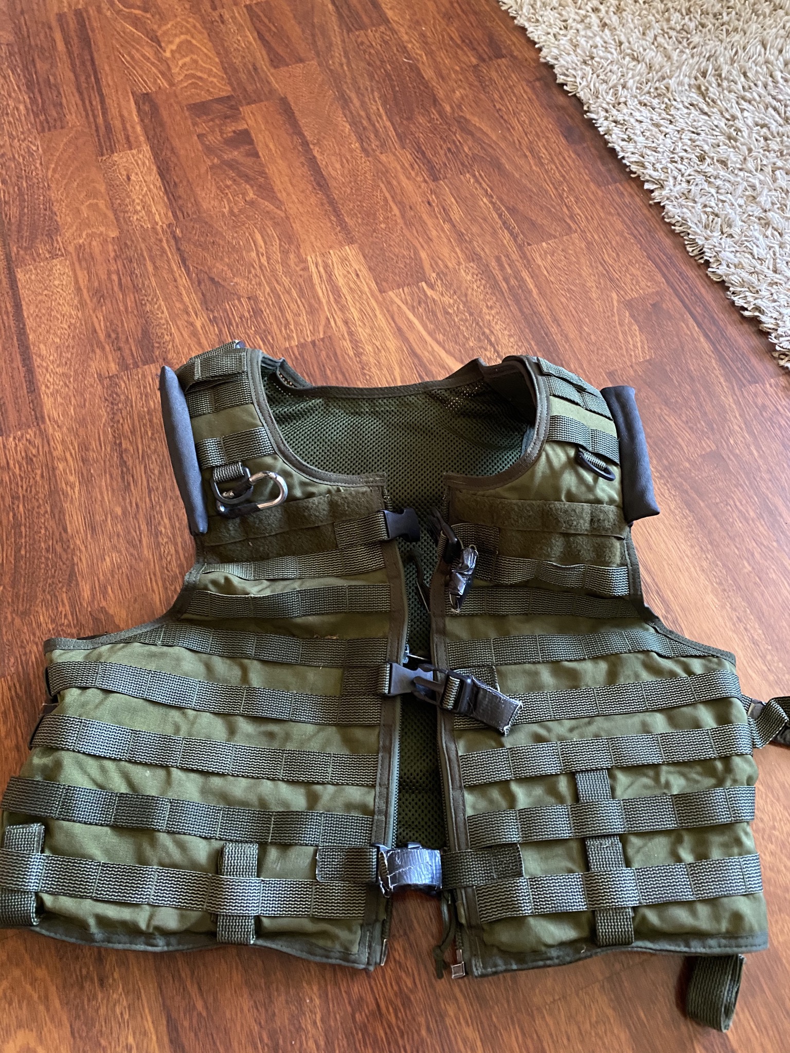 Müün kasutatud lahingvesti, 3L camelbagi ja digilaigus meditsiini tasku molle kinnitusega. Kõik ostetud Galvilindast. Lahingvesti miinuseks on see, et vestil on lukk katki. Camelbag ja paun täiesti korras.