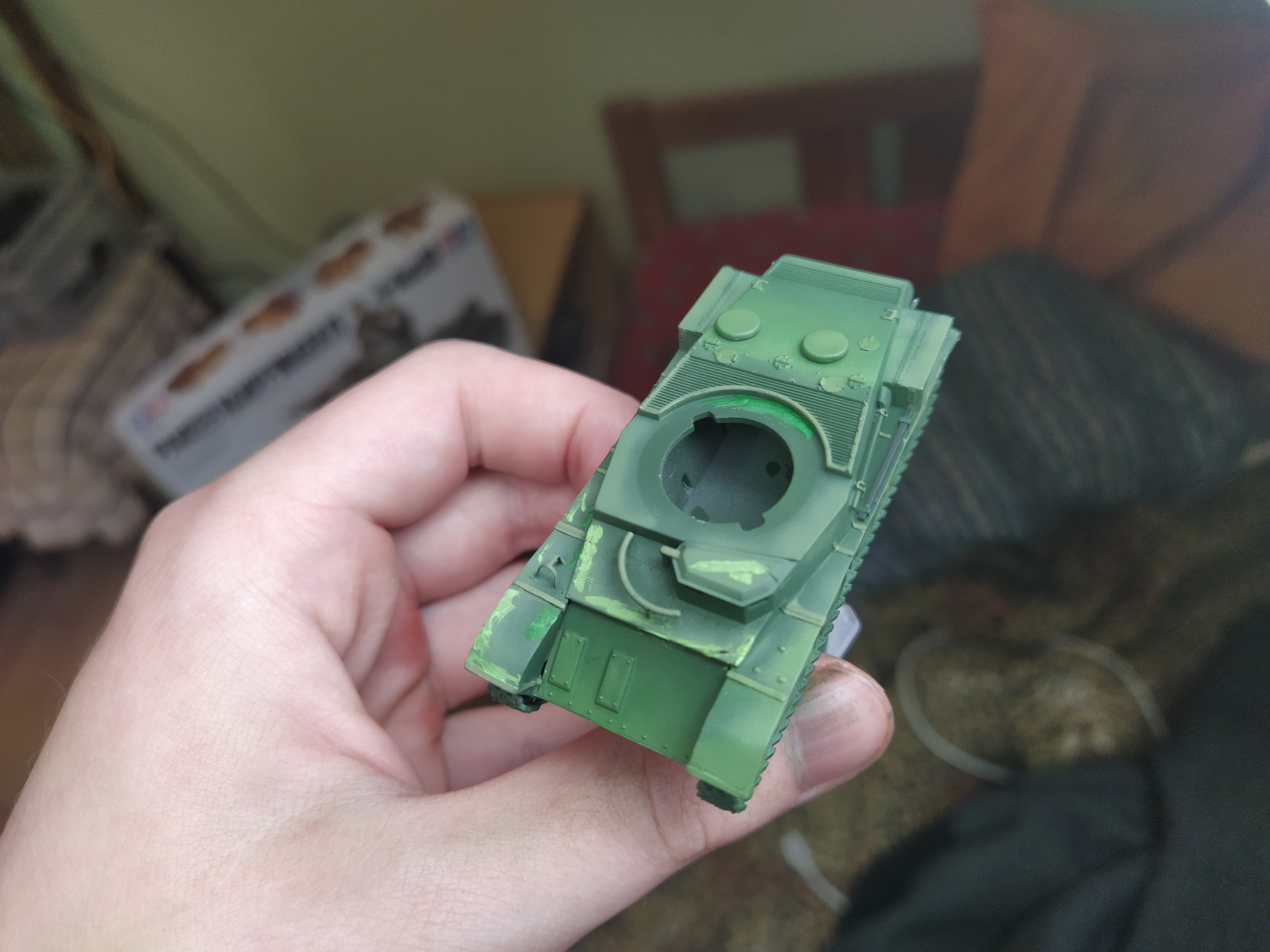 Esmalt lasin terve mudeli üle Tamiya semi glossiga, mille järel kasutasin washe/pesu. Seejärel tuli chippimine ja õlivärvidega streakimine ning tolmu aluskiht.