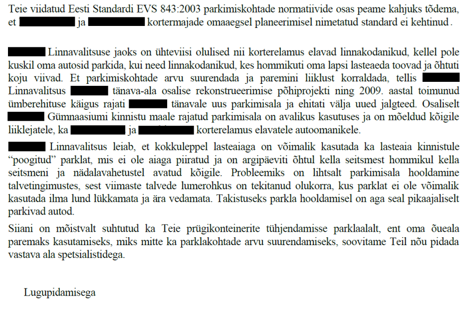 Ühe maja eest tahtis KOV ära kaotada kõik 30 parklakohta aga minu "kisa peale" 8) pandi projekt sisma ja lõpuks me andsime oma kinnistust kogu tänavapoolse maa ära, et sinna saaks rajada uue kõnnitee ja saaks parkida ka mõned sõidukid. Sellele vaatamata jäi 30 parkimiskoha asemel pärast tänava "rekonstrueerimist" järele ainult 16 parkimiskohta. Teise maja ees oli 36 parkimiskohta ja kadus 6 parkimiskohta (ja nüüd anno 2020 või 2021 järgmise "renoveerimise" käigus kaotatakse veel 6 kuni 8 kohta).
