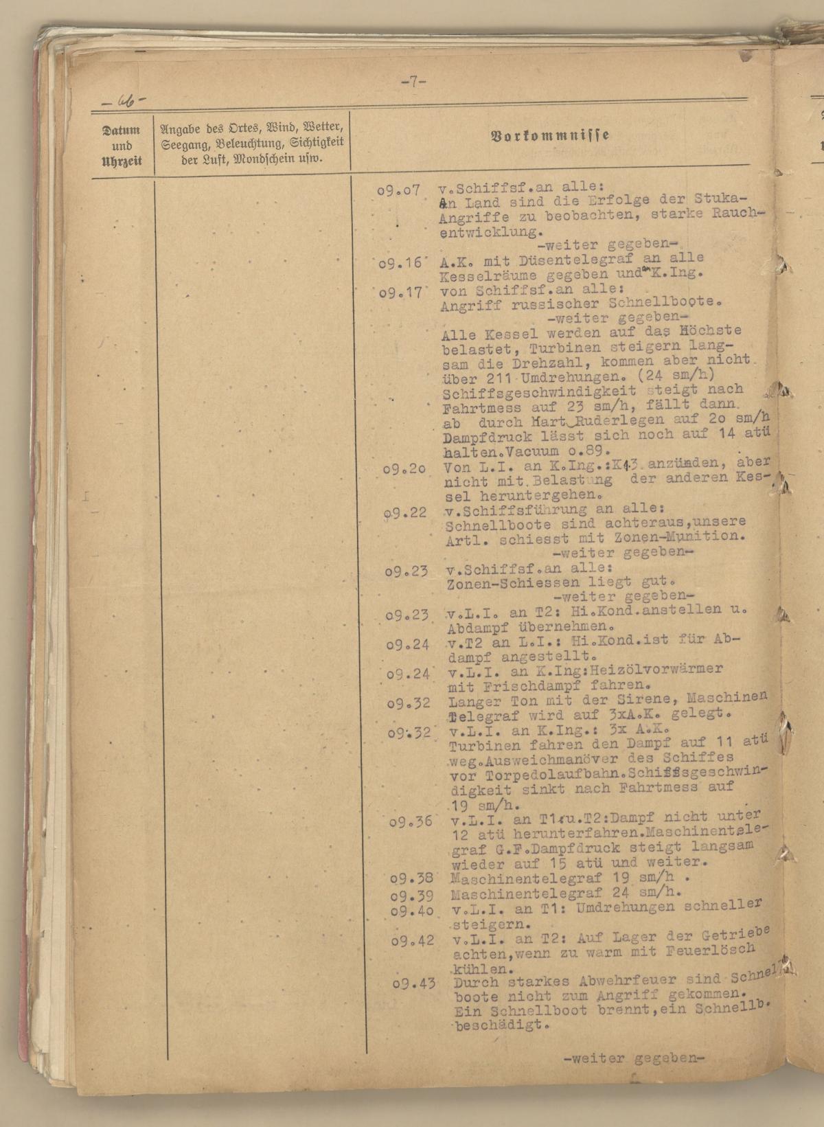 Teki all masinate juures peeti oma sõjapäevikut (KTB, Abschnitt Maschine). Seal on kirja pandud, kuidas meeskonda merel toimuvatest sündmustest informeeriti.