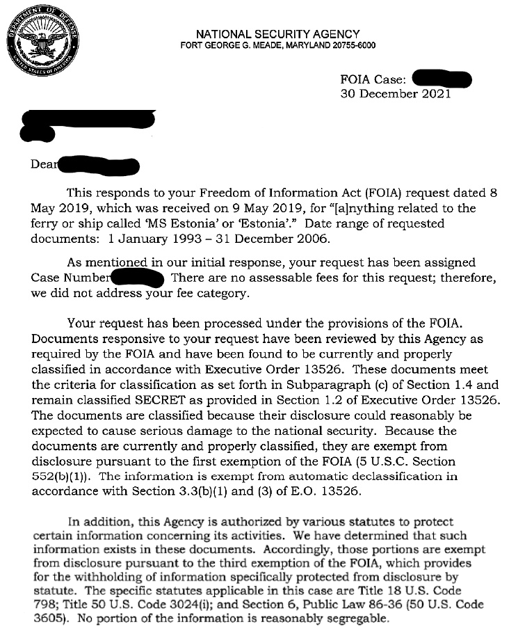 Lisan veel, et ma ei pööranud järeldustes oleva vea lahtiseletamisele ilmselt piisavat tähelepanu. Jutu iva oli selles, et NSA enda dokumendid Estonia huku teabe kohta on jätkuvalt salastatud, kuid sellega seotud infot leidub ka teis(t)el USA riigiasutus(t)el, ja teoreetiline võimalus (kuigi minu hinnangul vähetõenäoline) on, et see pole salastatud.