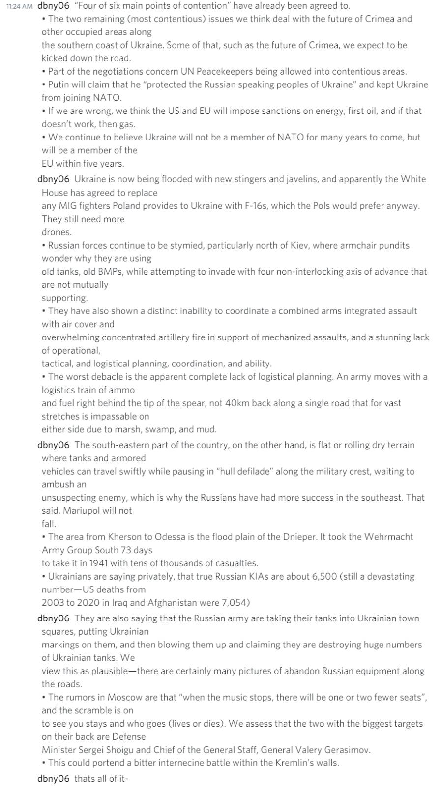Aga ma kardan jätkuvalt, et kui esimene mure on uus pealetung, siis kui see õnnestub tagasi lüüa, on järgmine mure Vene armee kaevumine ja olukorra stabiliseerimine põhjarindel, et lõunas ja idas edasi pressida. Nii 2-3 nädala perspektiivis näiteks. Kui Vene armeel üldse on selles sõjas olnud õnnestumisi, siis on selleks Ukraina jõudude sidumine põhjas, et saaks edeneda lõunas ja idas. VF motivatsioon mõistlikel tingimustel rahuläbirääkimisi alustada ei teki enne, kui vene initsiatiiv lõunarindel murtakse. Seni on vara Venemaad maha kanda. Hambad ristis panevad edasi ükskõik milliste ohvritega.