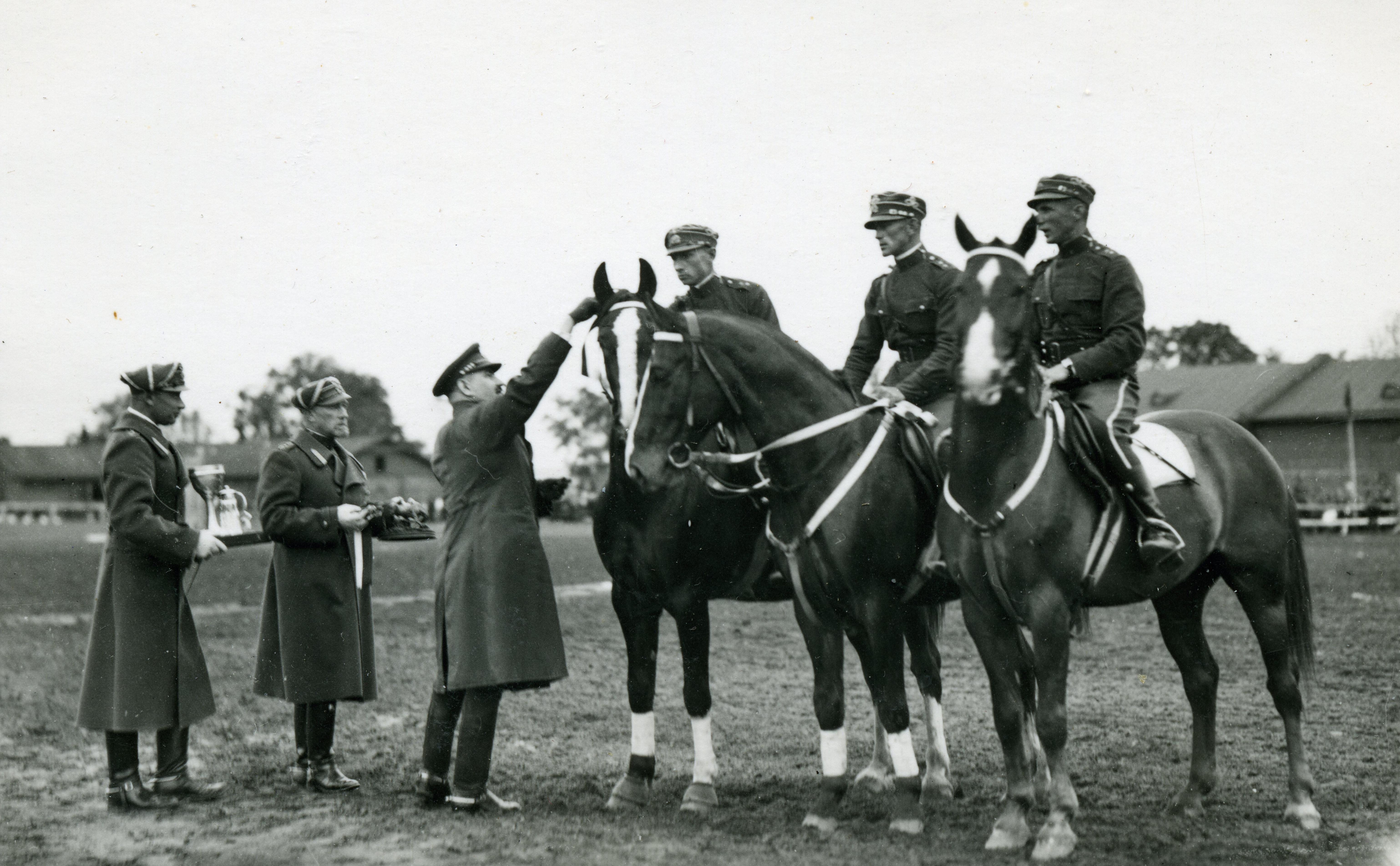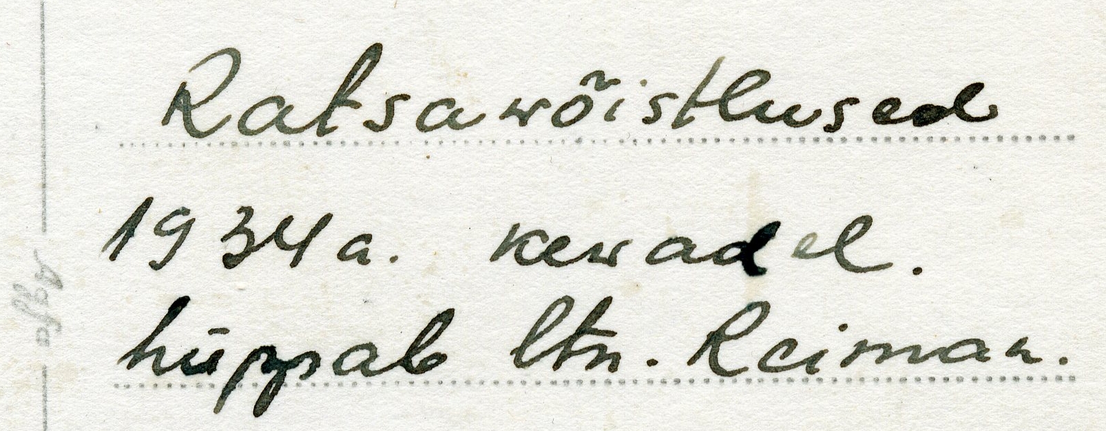 Pildi taga kiri: "Ratsavõistlused 1934 a. kevadel. Ohvitseride A. II. võitjad I ltn Reiman, II ltn Sutt ja III ltn Pärlon." Nimedes päris kindel pole, igaüks saab pildi taha kirjutatu põhjal hinnata.