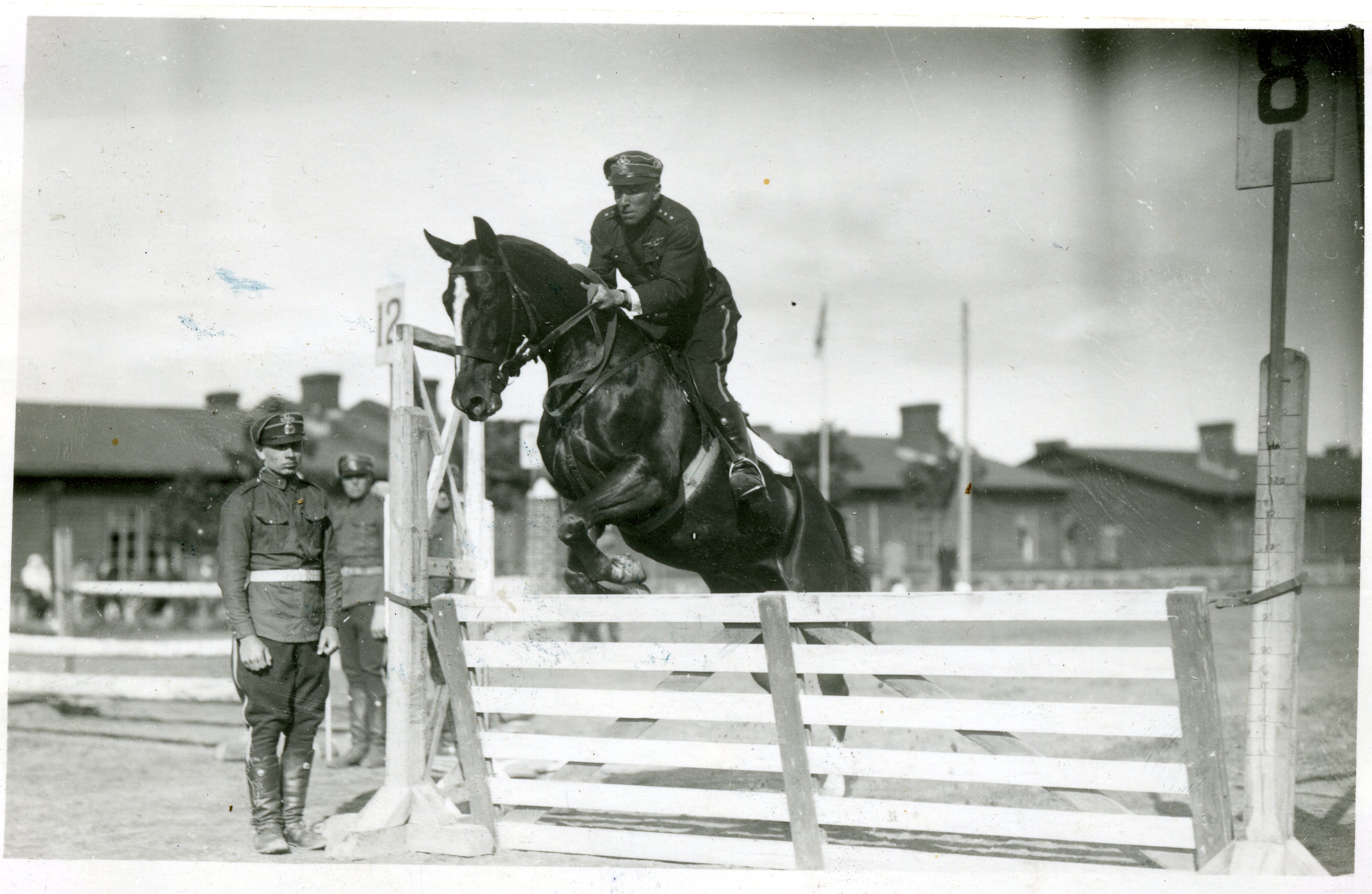 Nüüd selle kategooria viimane pilt, hüppab (hobuse seljas) ltn Reiman. Publikuhuvi tundub päris suur, platsi ääres paistab palju rahvast olevat.