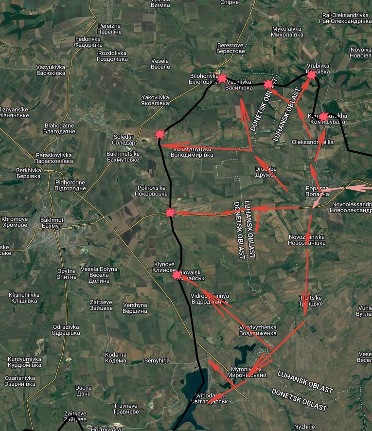 Kaardil on rindejoon märgitud kõikjal asulate ette (ühel juhul kipsikarjääri aherainemäe ette): https://www.google.com/maps/d/u/0/viewe ... 25697&z=11oleeg kirjutas:Näib, et rinne on seisma saadud. Ülevaades olukorrast tervikuna ja lõpus ca 10 min on jutt Bahmuti tee hoidmise vajadusest.Oleg Ždanov: tee Bahmuti on Ukraina elutee