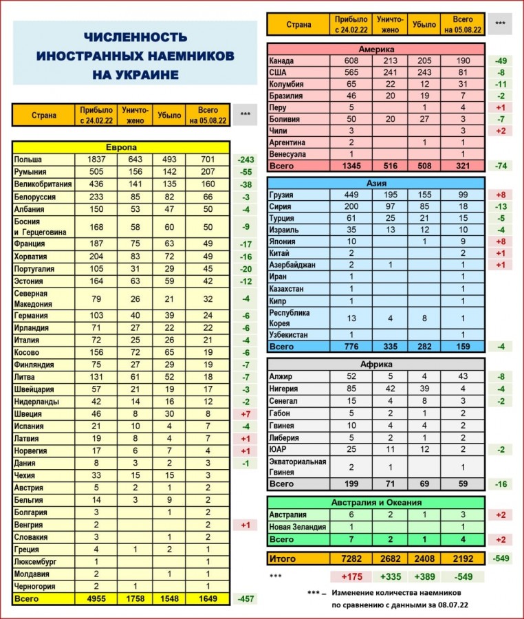 Paduvene ¤¤¤ cassad annab, tuginedes vene kaminale nn. "palgasõdurite" arvud august 2022 kontinentide kaupa.