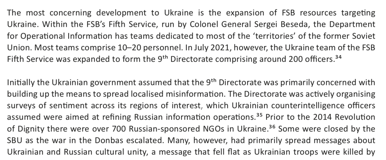 Luureandmed näitavad, et Ukraina eest vastutav FSB üksus paisus sõjaeelsetel kuudel oluliselt ja toetus ulatuslikule palgaliste agentide võrgustikule Ukraina julgeolekustruktuurides. Osa neist tegi Venemaaga siiralt koostööd ja õõnestas Ukraina kaitset, kuid teised pistsid FSB-lt saadu raha tasku, kuid keeldusid Kremlit abistamast, kui sõda puhkes.