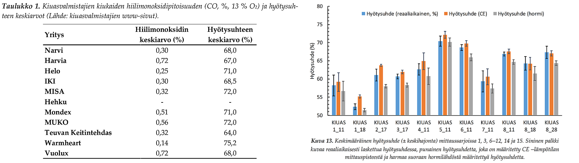 Sealt uurimusest vasakpoolne tabel - Soome tootjate poolt deklareeritud puitkeriste kasutegurid, parempoolne - 8 erineva kerise mõõdetud kasutegurid.