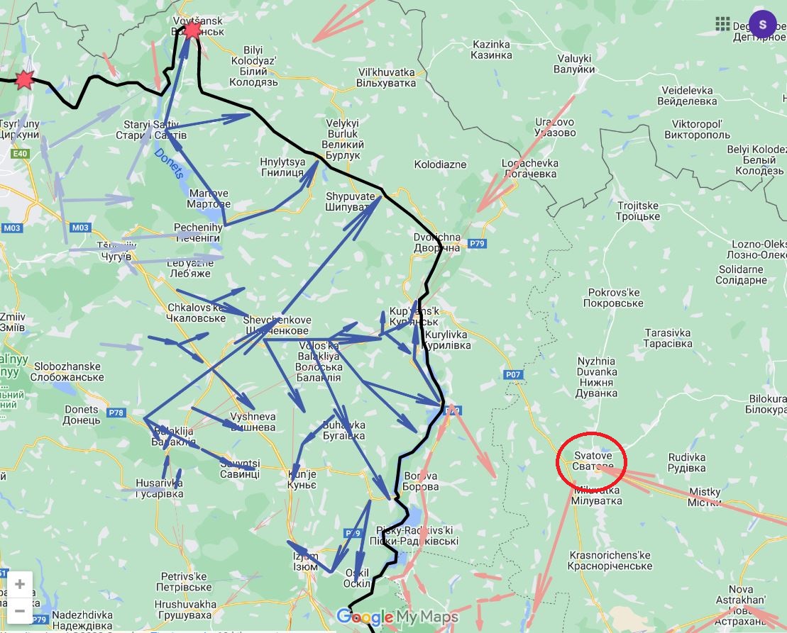 Täiendus. Kaart mutub nii dünaamiliselt, et tuleb hakata pilte tegema. Väidetavalt on sihikule võetud juba Svatove (tähistatud punase ringiga).