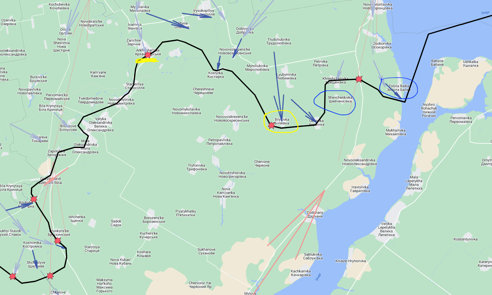 Seetõttu on lihtslast üllatav, et ukrainlased suudavad edasi liikuda hoopis vahetult vastu Dneprit, mis peaks suurtüki/MLRS toetuse vastu nende väed oluliselt haavatavamaks jätma, eriti kui arvestada sealse lageda põllu + droonivaatlusega.