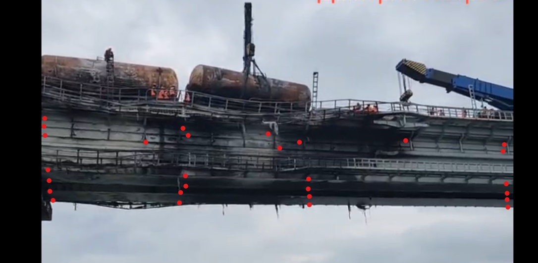Ole hea mees palun vasta mulle siis, millega seletada asjaolu, et antud lisatud pildil ei õnnestu mitte kuidagi moodi panna neid minu pandud punaseid punkte ühe sirge peale? Iga identitava liini peale on 4 punkti. No ei moodustu ühestki neist ju ühte sirget. KÕIK liinid on kõverad. Samas sellessamas videos kõrval olevad kaks kahjustamata sambavahet on sama trikiga kontrollituna kõik liinid kenasti sirged. Kui nüüd hakata umbmäärasemaltki arvutama tala(de) (teine pool ju kah nagu sirgetest näha!) läbipainde sügavust, siis võttes arvesse kaugust objektini ja deformatsiooni ulatust juba ka ekraanil nähtavana, siis lambist no nii minimaalseimalt 40-50 cm ehk sellel põlengupoolsel talaosal. Umbes samat suurusjärku toetab ju ka sillaplaadil tehtud foto relssidest ja nende peal olevaist vaguneist. Vähemalt see külg on lihtsalt kuumaga kõveraks ja laiali vajunud.