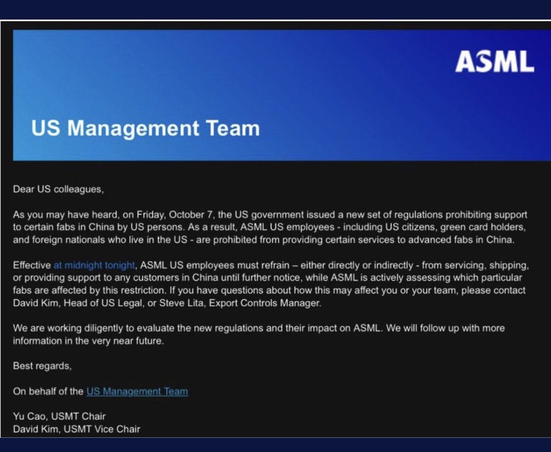 Selline asi siis, et sellel nädalal kehtestas Biden kiipidele uued ekspordi kontrolli meetmed. Kõik USA kodanikud, kes Hiinas antud valdkonnas töötavad said sisuliselt valida kas kaotada kodakondsus ja saada sanktsioneeritid või lõpetada sellels valdkonnas Hiins töötamine. Kõik esitasid lahkumisavalduse. Ühe tõmbega saatis Biden hiina aastaidnja aastaid tagasi. Näiteks ASML lõpetad päevapealt kogu tegevuse.