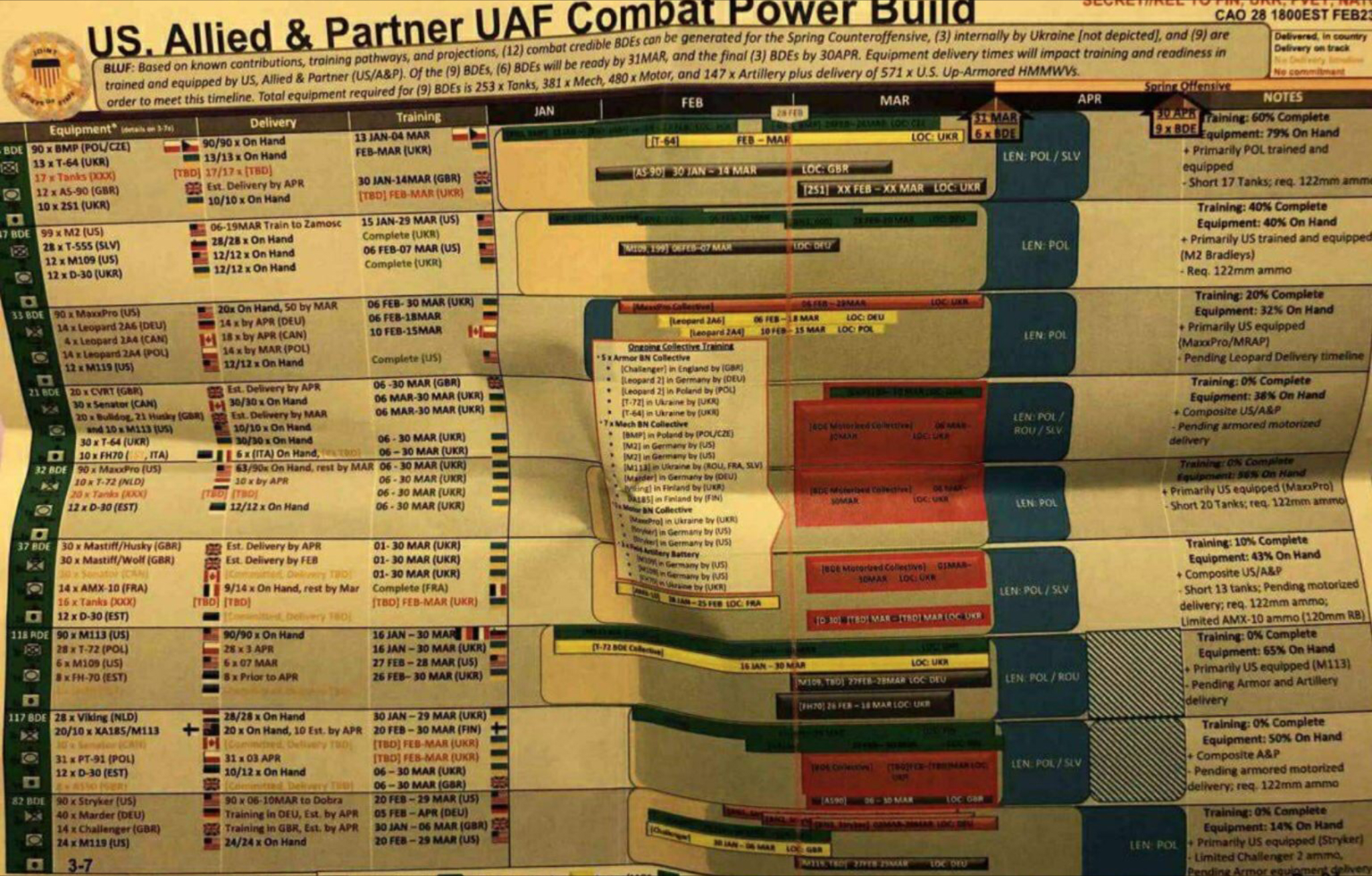 Kui selle skandaali jätkuna ei ilmu mingisuguse uue rõhuasetusega dokumente, siis võib mulje jääda, et lekitamise eesmärk on utsitada tagant Ukraina sponsoreid ja manitseda aial istujaid( L-Korea ja Iisrael) või suisa vastutöötajaid (Egiptus). Selle skeemi "Notes" tulp (kommentaariga "Peamiselt USA antud") teeb ju must valgel selgeks, mida on Ukrainale vaja uute üksuste lahinguvõimelisuse saavutamiseks. Kas see mitte ei karju Ramsteini Ukraina toetusgrupi liikmetele näkku?