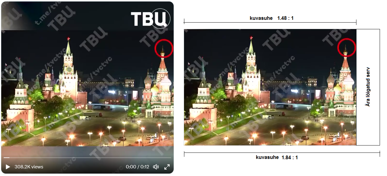 "Hlopokist" ekraanile ilmumiseni kulub 2,65 sekundit, ekraani nurka ilmumisest allalaskmiseni "Senatorski Dvoretsi" kupli/lipumasti taga kulub 2,70 sekundit ehk, et "hlopokist" drooni kaadrisse ilmumiseni on läbitud droonil umbes sama distants mille ta videos nähtavalt läbib enne alla laskmist.