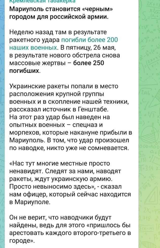 Seega vähem kui 1 AFU tanki hävitamine päevas Wagnerite poolt rinde kõige kuumemal lõigul pideva edasiliikumisega on vähe rohkem kui objektiivne. Ma hindaksin vastase inimkaotusi (vastupanu Wagnerile igal pool, mitte ainult Bakhmutis) minu puhtalt isiklikul arvamusel ~20-27k hukkunuga.