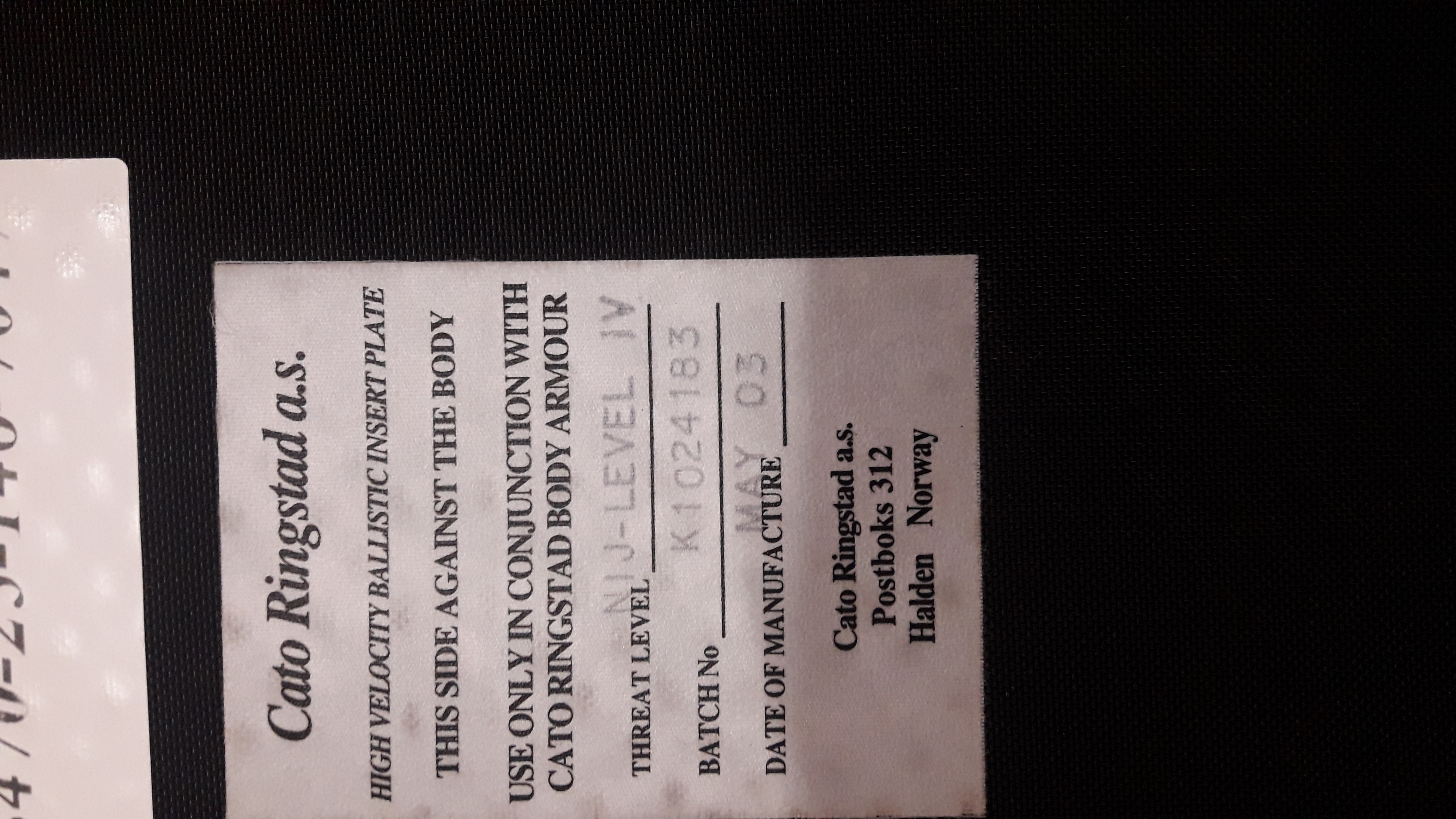 Mul on kogemata endal vestis plaadid, mida Bundeswehr omal ajal endale tellis. Plaadi tagaküljele on trükitud selline tabel, kus on kirjas igasugu detailid, alates tootja kontaktandmetest ja kaitseastmest kuni tootmise kuupäevani. Tootja firma Bristol Composites.