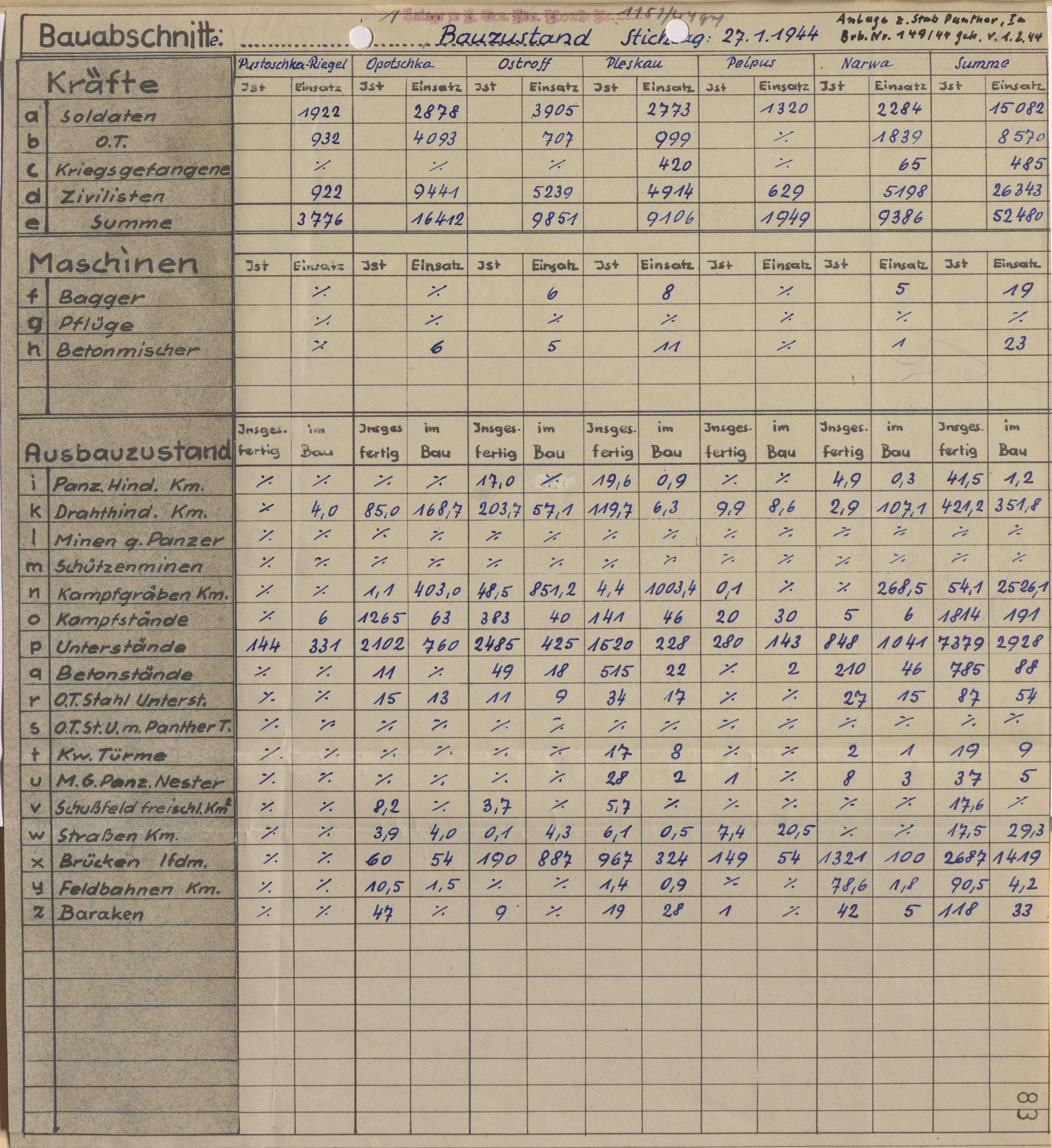 Lisatud Staap Pantheri algne juhtimisstruktuur ja kindlustustööde loetelu + seisukord vahetult enne venelaste rünnakut Narva piirkonnas. 20.-22. lõigus oli lõpetatud tööde osakaal tagasihoidlik, tõenäoliselt ressursside puudumise tõttu ja tähelepanu koondumisega Narva linna kaitsmisele.