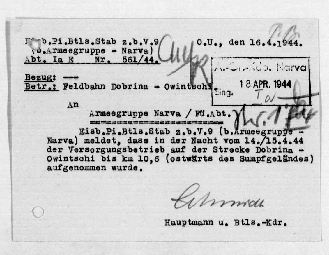 Tagasi väliraudtee juurde. Ehitusega alustati 1943.a oktoobris, nädalas paigaldati keskmiselt ca 5-6 km ja sellise tempoga oli 1944 a.jaanuri lõpuks ca 80 km väliraudteed valmis. Näidiseks lisatud tööde edenemise aruanne 1943.a novembris koostatud „Ostwall“ üldiselt plaanilt, kus Narva lõiku tähistati järjekorranumbriga 14.