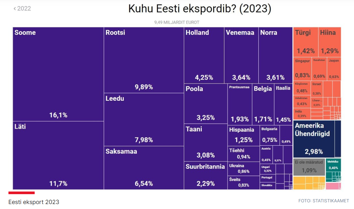 Eesti kaupade eksport Euroopa Liidu välistesse riikidesse on teinud Ukraina sõja puhkemise järgsel ajal läbi märkimisväärse muudatuse ning vastupidiselt peaminister Kaja Kallase eelmise nädala loosungitele on tollistatistika kohaselt peamiseks sihtriigiks Euroopa Liidu väliste riikide seas kerkinud justnimelt agressorriik Venemaa.