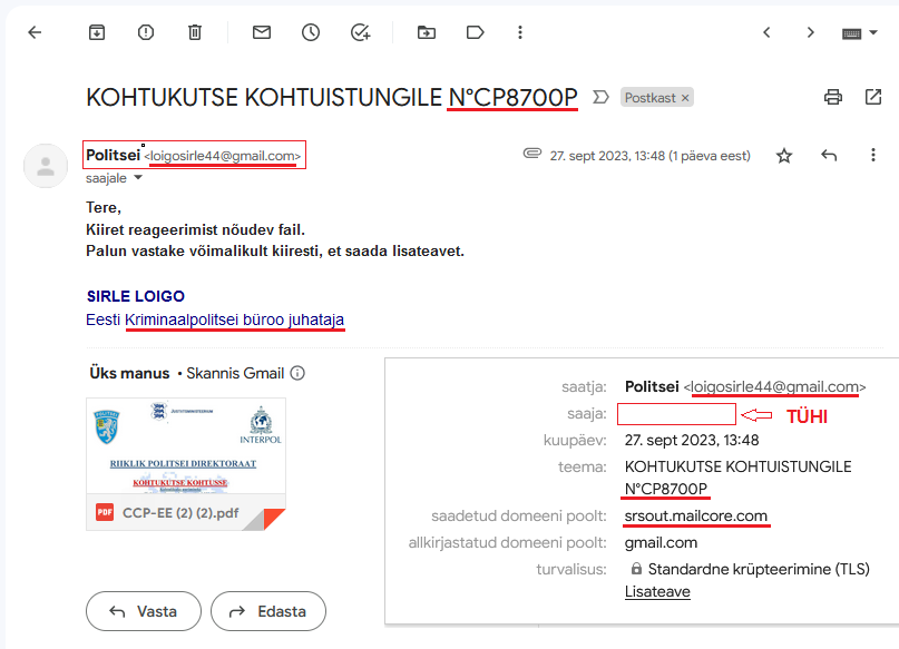 Esimeselt pildilt on näha, et "saaja" andmeväli on tühi ja meil on saadetud "srsout.mailcore.com" vahendeid/teenust/DNS serverit kasutades, saatjaks loigosirle44@gmail.com (meiliaadressi ei hakka ka kommenteerima.... "politsei" saadab siis mulle kirja GMaili postkastist ja ametnik kasutab meili aadressinimes numbrit 44... :mrgreen: - asjakohasem oleks olnud 69 :lol: )