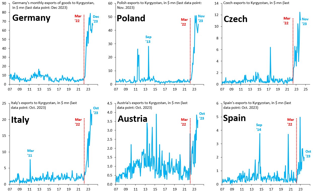 Saksamaa eksport Kõrgõzstani on kasvanud 1200% võrreldes enne Venemaa tungimist Ukrainasse. See värk läheb ilmselgelt Venemaale. Kogu ELis on see laialt levinud probleem. Poola eksport on kasvanud 1800%, Tšehhi 1200%, Itaalia 870%, Austria 340% ja Hispaania 140%
