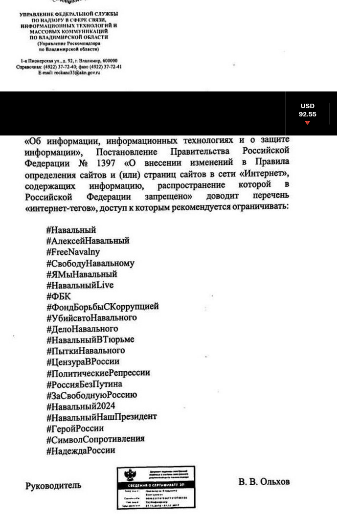 Roskomnadzor alustas Navalnõi sildiga väljaannete kustutamist. RKN-i Vladimiri oblasti osakonna vastavasisulise kirja avaldas Twitteris Peterburi aktivist Grigori Sverdlin, kes on viimased 10 aastat juhtinud kodutute heategevusorganisatsiooni Nochlezhka, nüüdseks sõjavastase projekti “Minge metsa".